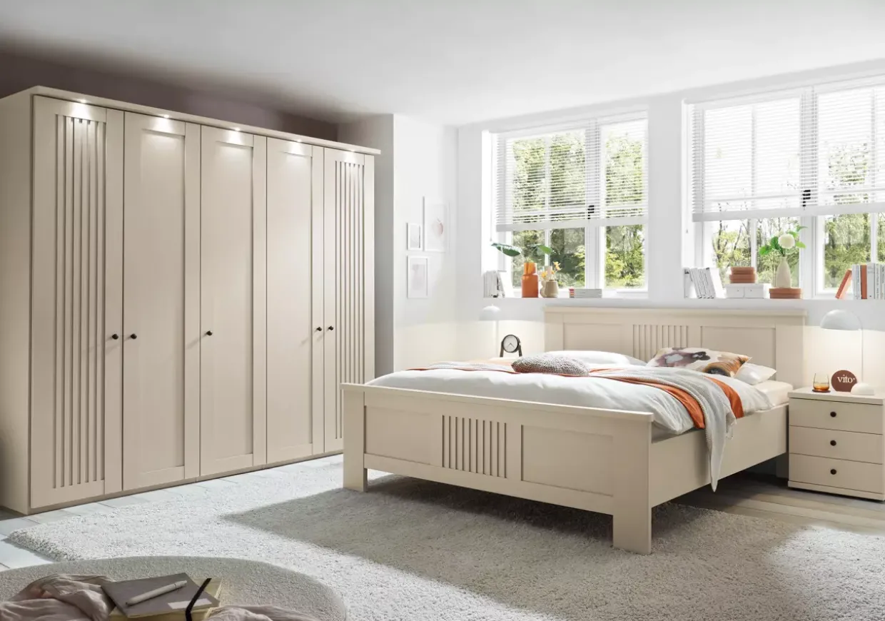 Metall-Kleiderstangen in robusten Metallhalterungen bieten zuverlässigen Halt für Ihre Garderobe. Der Schrank ist fünf-türig gestaltet, mit drei mittigen Türen, die durch Rahmentüren akzentuiert werden. Die Außentüren sind mit Lamellen versehen, die einen ästhetischen Reiz bieten und gleichzeitig die Belüftung unterstützen.