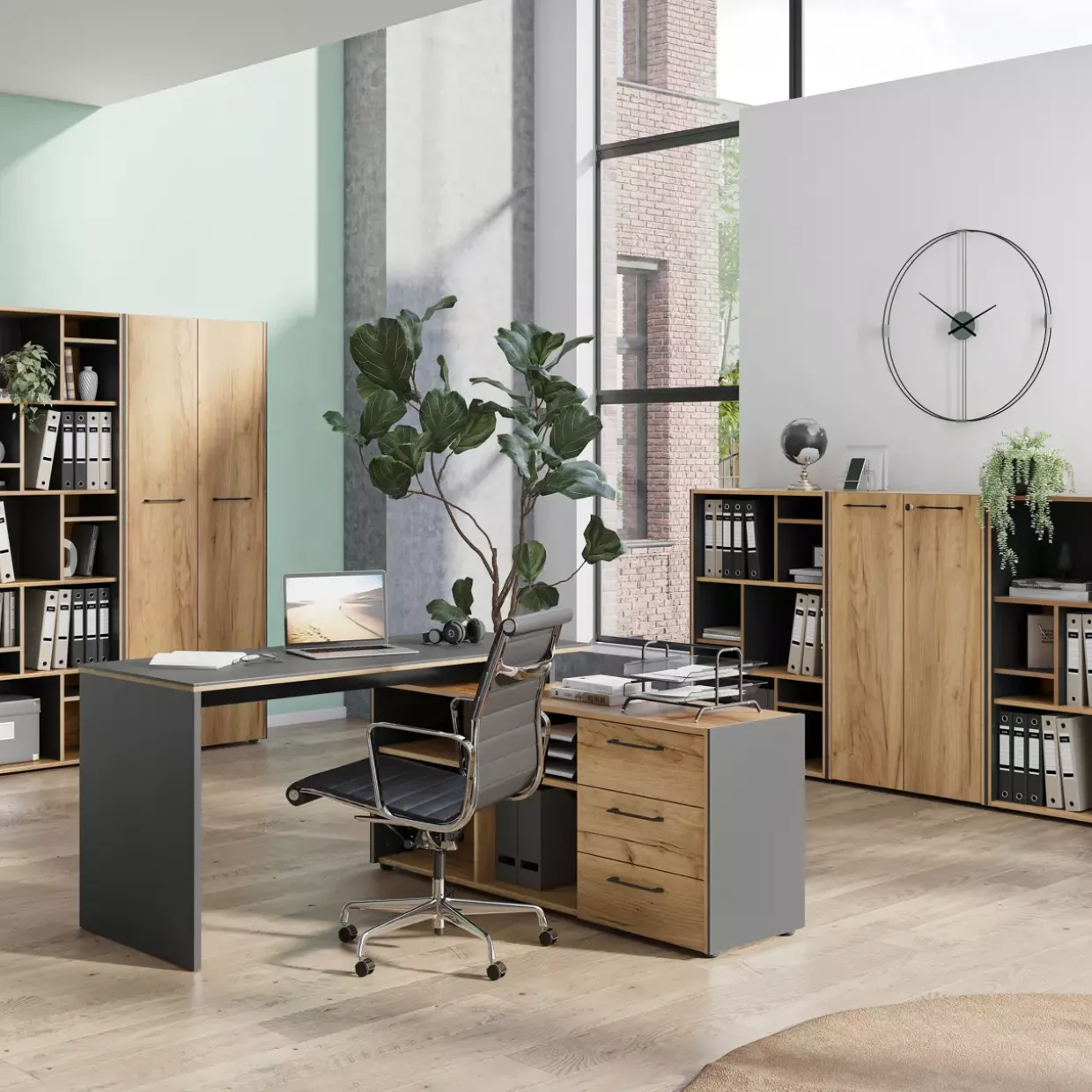 Eine geräuscharme Nutzung wird durch die Dämpfung und den Selbsteinzug von Türen und Schubladen gewährleistet. Praktische Sicherheitsfeatures wie die abschließbare Schublade des Rollcontainers und Türen des Aktenschranks schützen sensible Dokumente.