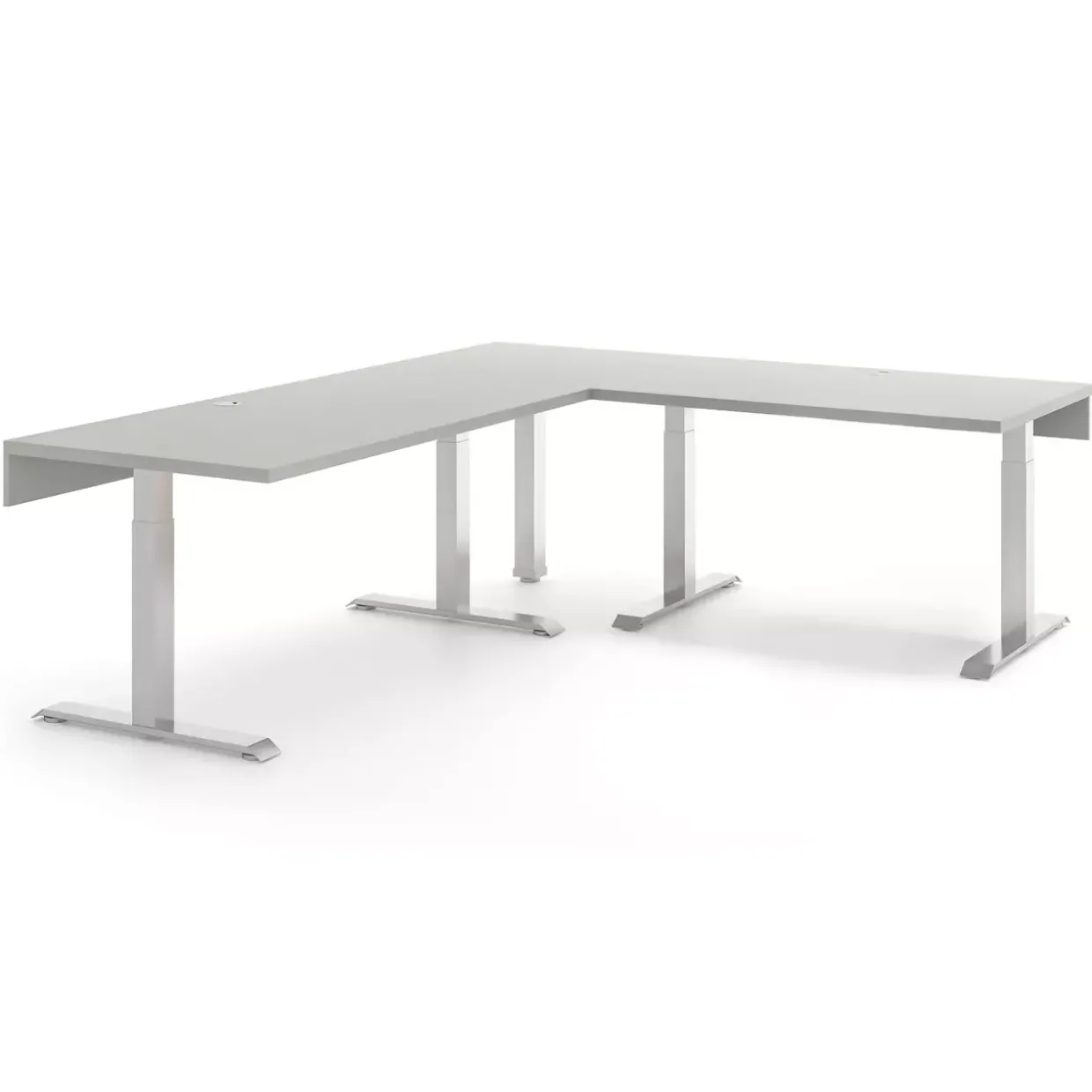Die moderne Eleganz der silbernen und kreidegrau matt lackierten Ecktischplatte wird durch ihr zeitgemäßes Design unterstrichen. Diese Eckverbindungsplatte, gefertigt aus hochwertigem Holzwerkstoff, bietet nicht nur stilvolle Optik, sondern auch praktische Funktionalität. Eine Besonderheit dieses Möbelstücks ist das elektrisch höhenverstellbare Metalluntergestell, das Ihnen die Möglichkeit bietet, die Höhe von 70 bis 118 cm nach Ihren Bedürfnissen anzupassen.
