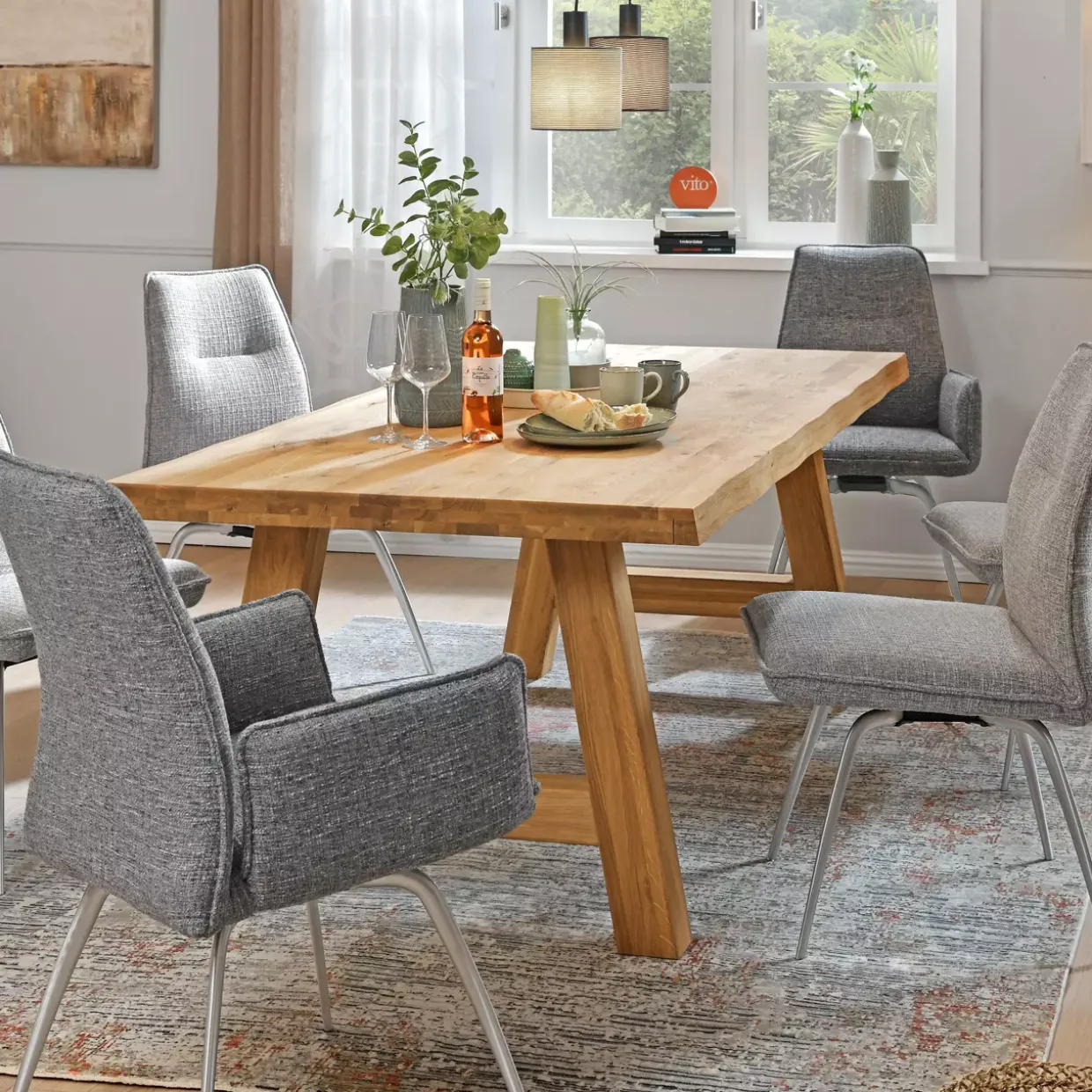 Eine Tischplatte aus Eiche-geölt und keilgezinkt verleiht dem Esstisch eine beeindruckende Robustheit und Eleganz. Der Siga VITO Esstisch vereint traditionelle Handwerkskunst mit modernem Design, was ihn zu einem echten Blickfang in jedem Esszimmer macht. Die natürliche Baumkante unterstreicht den rustikalen Cottage-Stil und schafft eine einladende Atmosphäre.