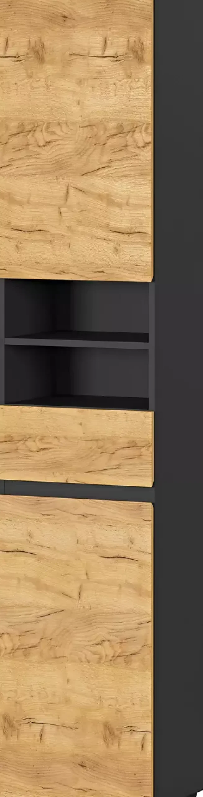 Graphitfarbene Akzente treffen auf die warme Ausstrahlung der Navarra Eiche Nachbildung und verleihen dem Modell Mayor eine moderne Eleganz. Dieser Hochschrank überzeugt durch seine durchdachte Gestaltung: Eine Schublade mit Soft-Close-Technik, zwei Türen mit Türdämpfung und ein offenes Fach bieten vielseitige Stauraummöglichkeiten. Die verstellbaren Einlegeböden hinter den Türen ermöglichen eine flexible Nutzung des Innenraums. Gefertigt aus hochwertigem Holzwerkstoff und Metall, verspricht der Schrank Langlebigkeit und Stabilität.