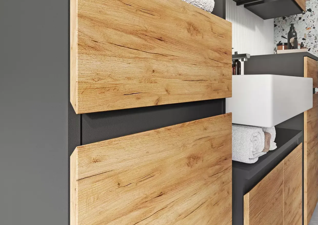 Besonders hervorzuheben sind die melaminharzbeschichteten Oberflächen, die nicht nur kratzfest und feuchtigkeitsabweisend sind, sondern auch eine grifflos elegante Optik bieten. Die robusten ABS-Kanten erhöhen die Stoß- und Schlagfestigkeit, was zu einer längeren Lebensdauer beiträgt. Die Push-To-Open-Funktion der Türen unterstreicht das moderne Design und sorgt für ein müheloses Öffnen.