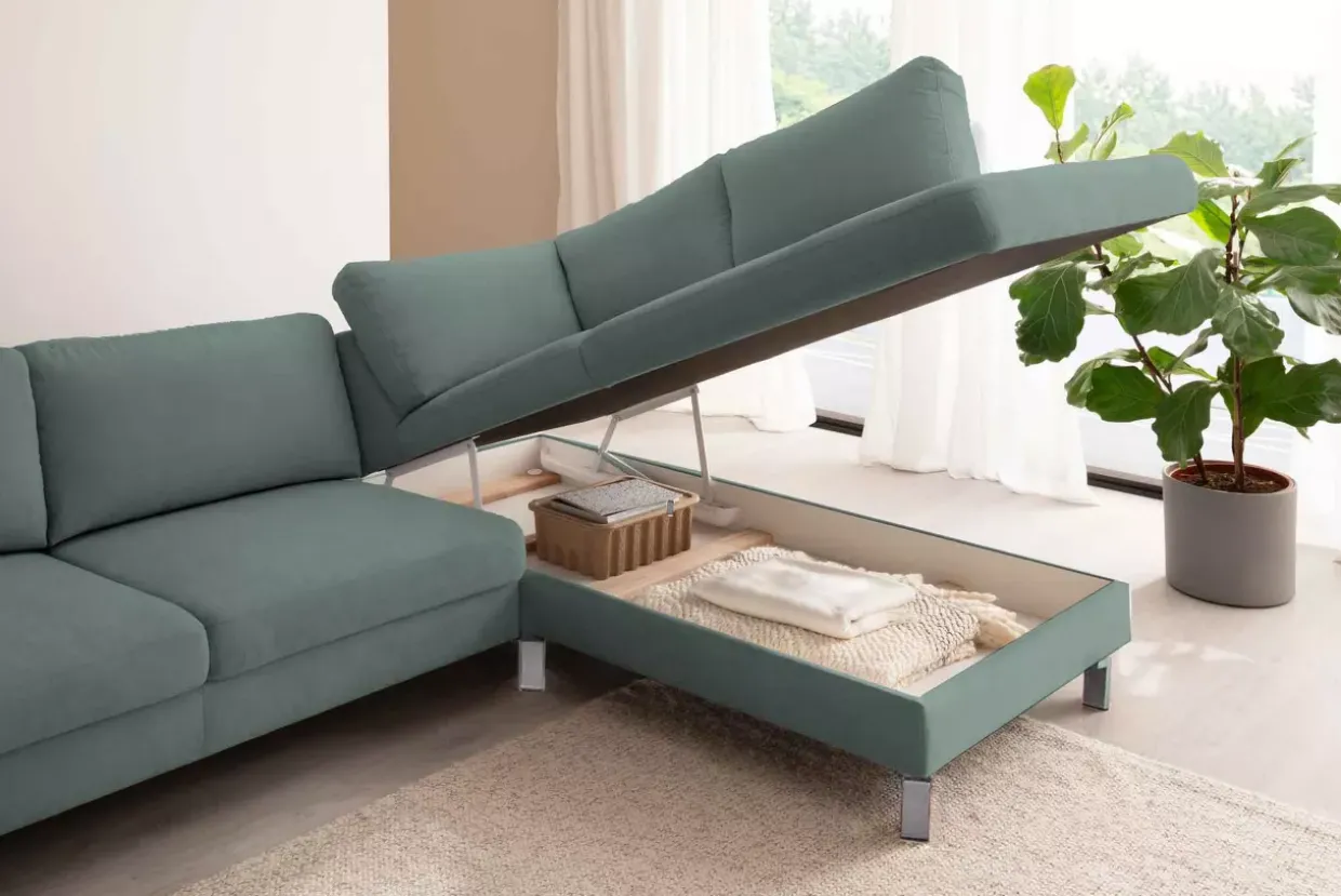 Ein komfortables Schlafgefühl bietet der Step-Basic 2.0 Polster mit seiner punktelastischen Taschenfederkernpolsterung. Die Kombination aus hochwertigem Stoff und robustem Metall verleiht dem Möbelstück eine elegante Erscheinung. Vielseitigkeit trifft auf Funktionalität dank der integrierten Bettfunktion als Querschläfer, die einen erholsamen Schlaf ermöglicht.Das Eckelement, zusammen mit dem 1-Sitzer, bietet eine clevere Stauraumfunktion. Es ermöglicht, Platz zu sparen und gleichzeitig Ordnung zu halten. Der Stauraum ist bequem durch Hochklappen der Sitzfläche zugänglich, was den täglichen Gebrauch erleichtert.Mit einem Echtbezug im Rücken präsentiert sich das Polster von allen Seiten attraktiv und ansprechend. Die Farben Picasso petrol und Chrom matt harmonieren perfekt und setzen stilvolle Akzente in jedem Raum. Der punktelastische Tonnentaschenfederkern sorgt in Verbindung mit Textilvlies, Schaum und Wattevlies für optimalen Sitzkomfort und Langlebigkeit.Ein Möbelstück, das sowohl als komfortables Bett als auch als stilvolles Sitzmöbel fungiert, bereichert jeden Wohnraum. Die durchdachte Kombination von Design und Funktion macht es zu einer ausgezeichneten Wahl für alle, die Wert auf Qualität und Stil legen. Entdecken Sie, wie dieses Polstermöbel Eleganz und Praktikabilität in Ihrem Zuhause vereinen kann.