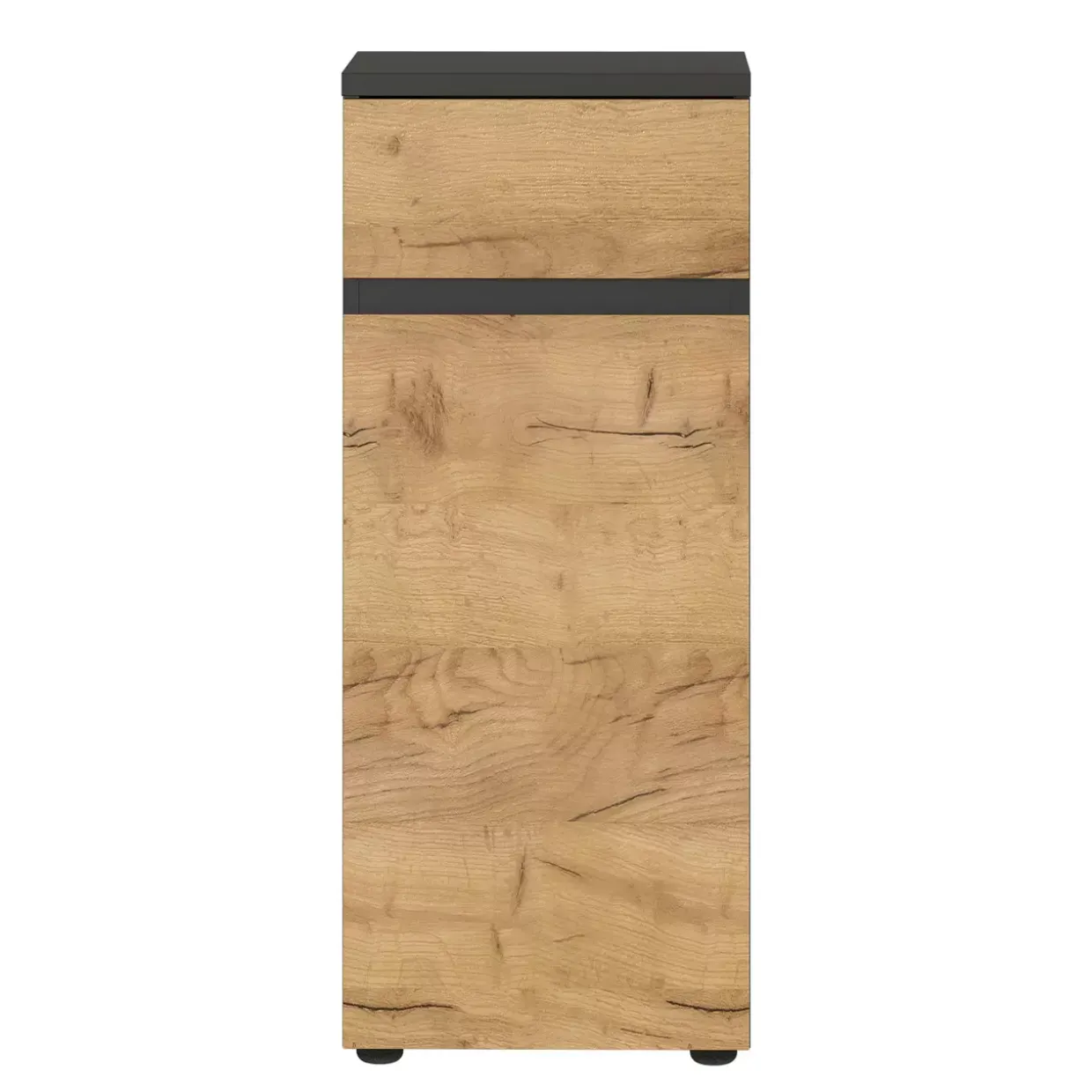 Die unverwechselbare Kombination aus Graphit und Navarra-Eiche-Nachbildung verleiht dem Unterschrank Mayor einen modernen und zugleich eleganten Charakter. Stilvoll und funktional, bietet dieser Unterschrank durch seine Maße von 39 x 95 x 34 cm ausreichend Stauraum. Die zwei verstellbaren Einlegeböden und die Schublade mit Selbsteinzug sorgen für eine flexible Nutzung des Innenraums, während die Drehtür mit integrierter Dämpfung für sanftes Öffnen und Schließen konzipiert ist.