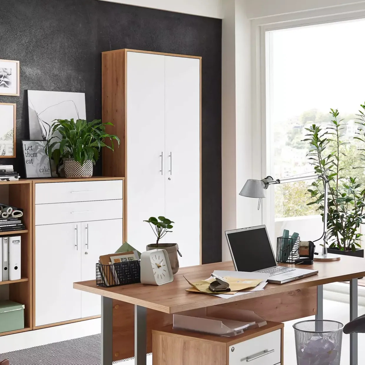 Abschließbar und sicher – dieser Aktenschrank vereint Funktionalität und modernes Design auf elegante Weise. Die klare Linienführung in Weiß und braunen Tönen verleiht jedem Raum eine zeitgemäße Note. Die Kombination aus Holzwerkstoff und einer folierten Oberfläche sorgt für eine robuste und zugleich stilvolle Erscheinung.