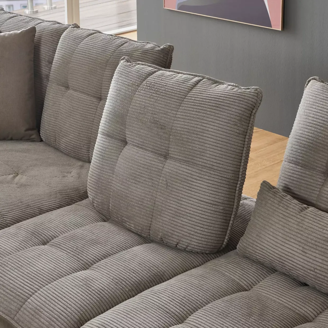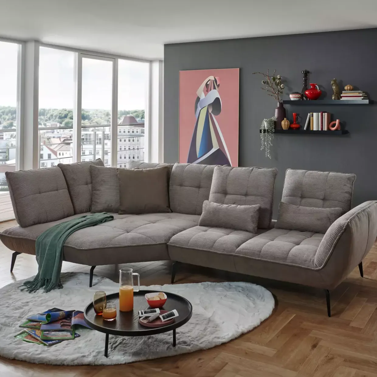 Das Bezugsmaterial aus Textil zeichnet sich durch seine Strapazierfähigkeit und einfache Pflege aus, was ihn besonders alltagstauglich macht. Im Zusammenspiel mit den klaren Linien und modernen Akzenten entsteht ein Möbelstück, das sowohl optisch als auch haptisch überzeugt.