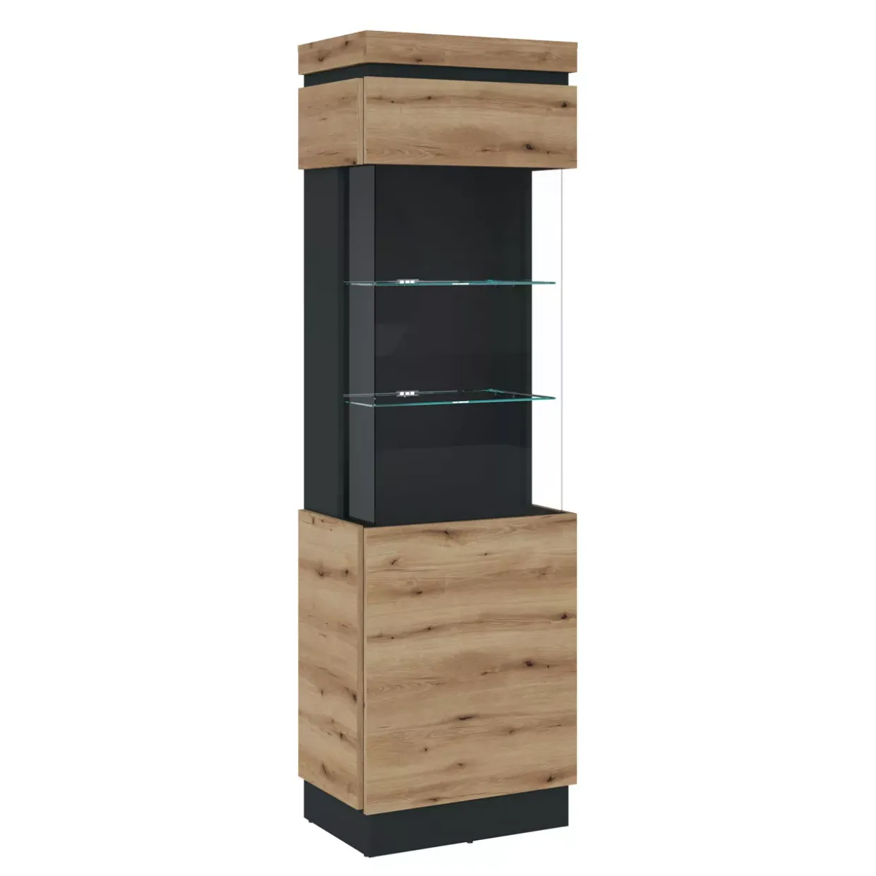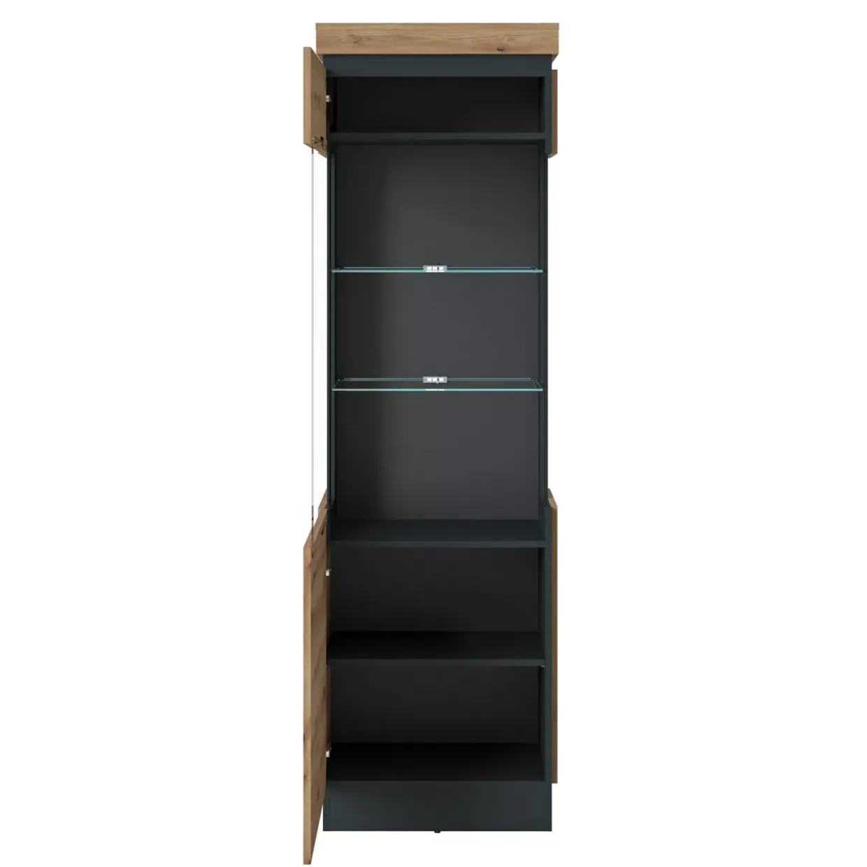 Mit ihrem klaren und reduzierten Erscheinungsbild fügt sich die Vitrine harmonisch in Ihr Zuhause ein, ohne sich aufzudrängen. Die klaren Linien und das dezente Design ermöglichen es, die Vitrine flexibel zu kombinieren, sei es mit anderen Möbelstücken oder Dekorationselementen. So bleibt Ihnen viel Spielraum für Ihre persönliche Gestaltung.