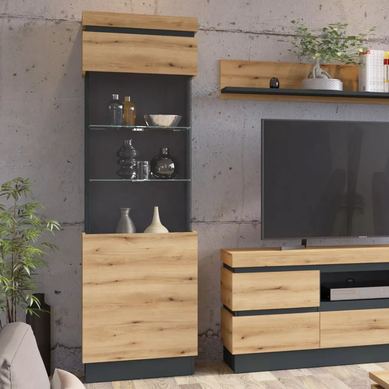 Eiche grau verleiht der Vitrine eine elegante und zeitlose Optik. Diese Farbe harmoniert hervorragend mit dem modernen Stil des Designs, das sich nahtlos in verschiedene Wohnkonzepte einfügt. Als hochwertiger Holzwerkstoff bietet das Material sowohl Stabilität als auch Langlebigkeit, sodass Sie lange Freude an Ihrem Möbelstück haben können.