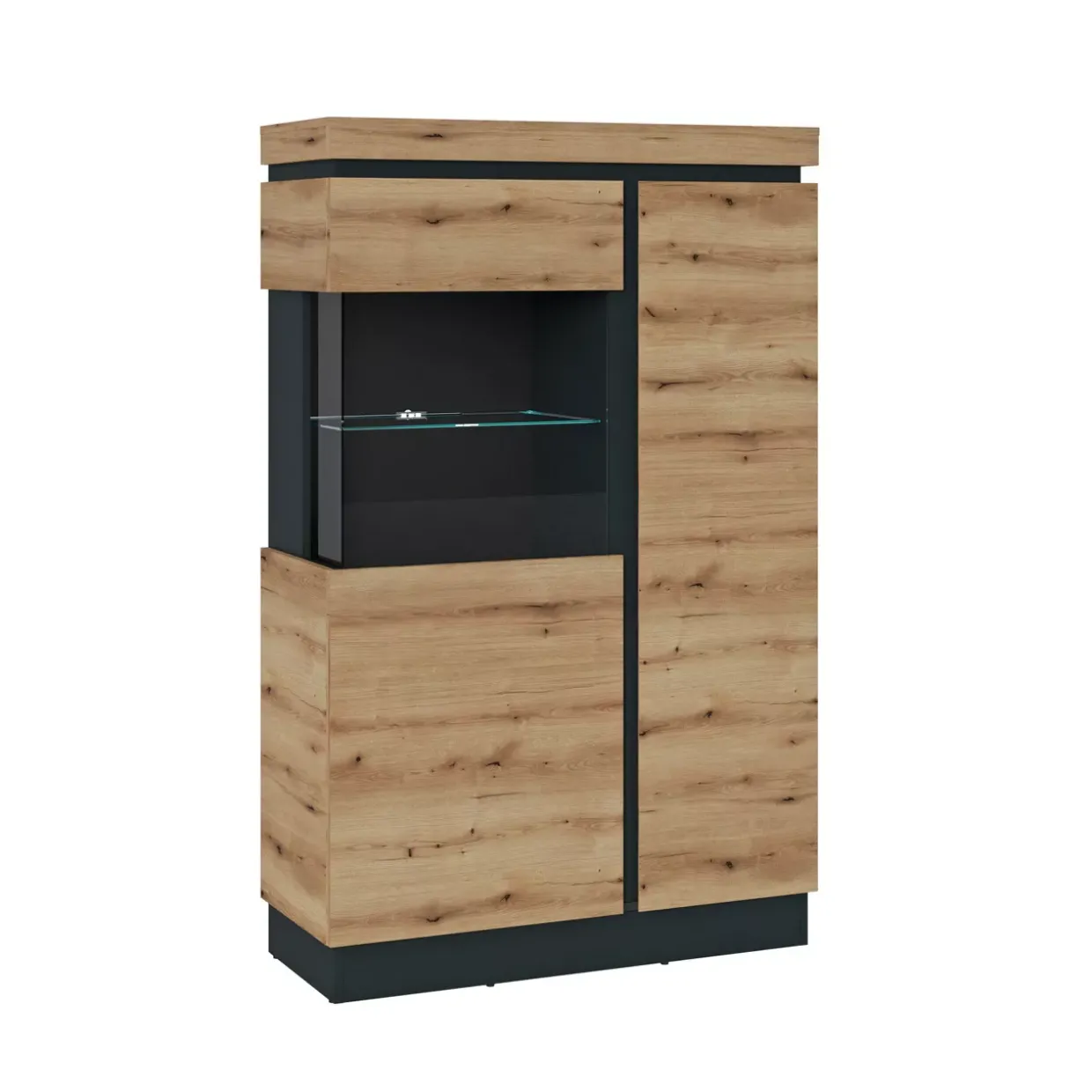 Eiche grau verleiht Ihrer Einrichtung eine zeitlose Eleganz. Diese Farbe harmoniert hervorragend mit dem modernen Stil der Corte Vitrine, die in Ihrer Wohnung einen Hauch von Raffinesse versprüht. Die Vitrine besticht durch ihr minimalistisches Design, das sowohl Funktionalität als auch Ästhetik in den Vordergrund stellt.