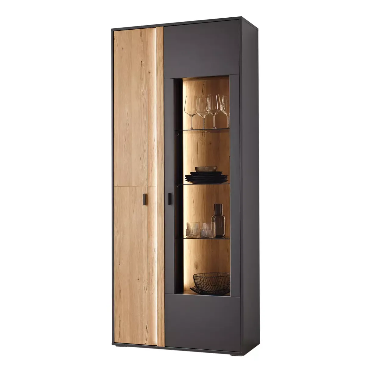 Ein stimmungsvolles Highlight setzt die integrierte Frontbeleuchtung der Vitrine Butera. In einem klassischen Stil gehalten, kombiniert dieses Möbelstück Funktionalität mit einer ansprechenden Ästhetik. Die Farbgebung in Anthrazit Dekor, ergänzt durch die Absetzung in Eiche Gustavson Dekor, verleiht Ihrer Inneneinrichtung eine harmonische und zugleich moderne Note.Hergestellt aus robusten Materialien wie Holzwerkstoff und Metall, verspricht die Vitrine Langlebigkeit und Stabilität. Sie bietet mit einer Holztür und einer Glastür vielseitige Möglichkeiten der Präsentation und Aufbewahrung. Während hinter der Holztür persönliche Gegenstände diskret verstaut werden können, präsentiert die Glastür Ihre schönsten Dekorationsobjekte oder Sammlerstücke stilvoll.Die Butera Vitrine ist nicht nur ein praktisches Möbelstück, sondern auch ein elegantes Designelement, das in verschiedenen Räumen perfekt zur Geltung kommt. Ob im Wohnzimmer, Essbereich oder in der Diele – sie fügt sich nahtlos in unterschiedliche Einrichtungsstile ein und bietet dabei genügend Stauraum für Ihre Bedürfnisse.Beim Betrachten der Vitrine wird schnell klar: Hier trifft durchdachtes Design auf Funktionalität. Mit ihrem zeitlosen Charme und den hochwertigen Materialien wird sie zu einem wesentlichen Bestandteil jeder stilvoll eingerichteten Wohnung.