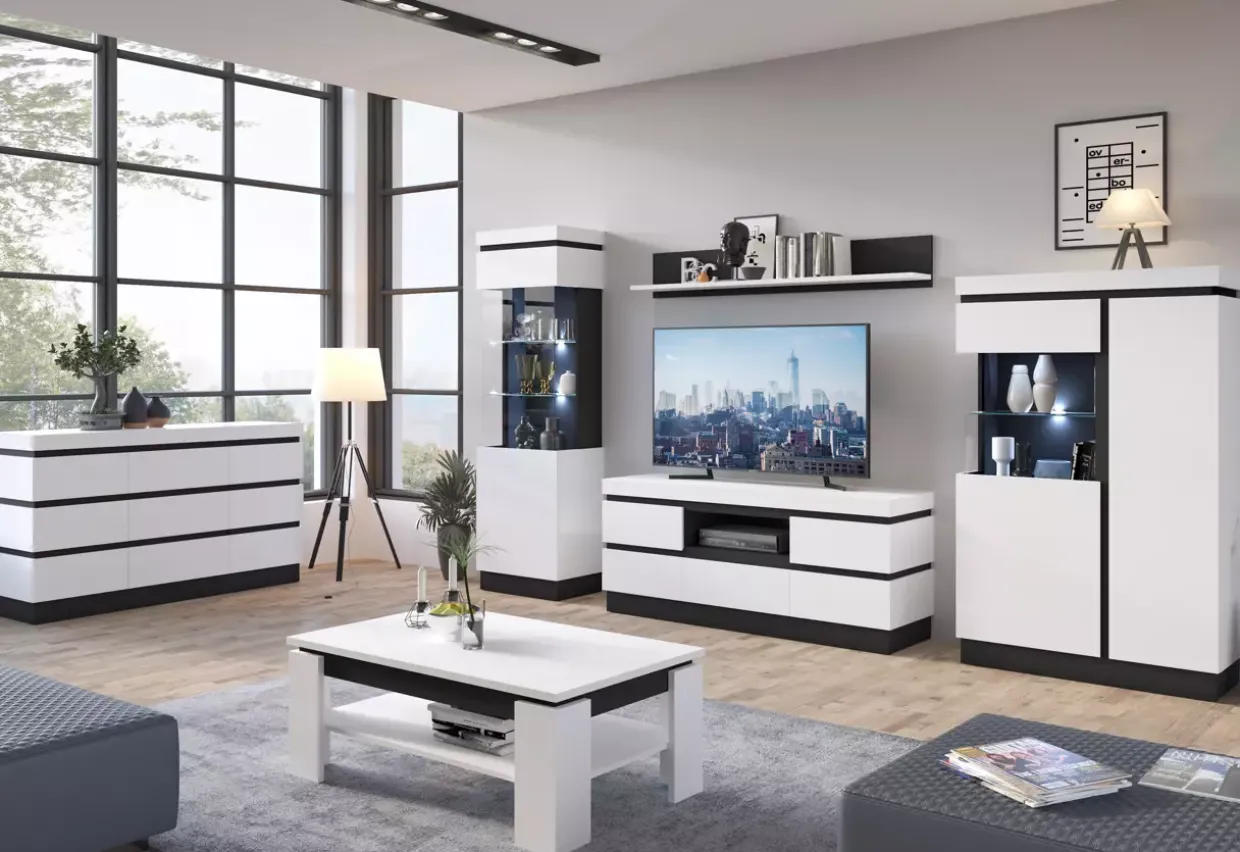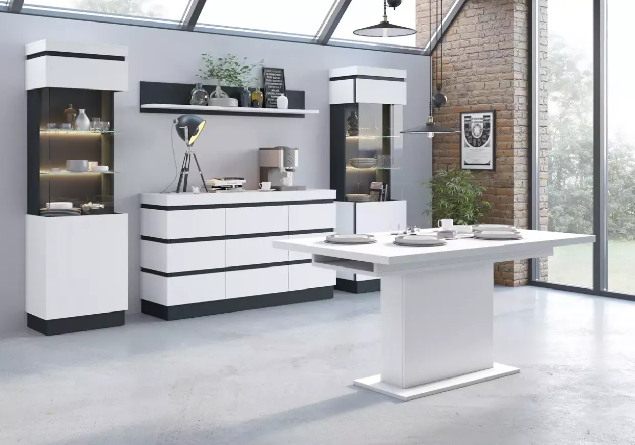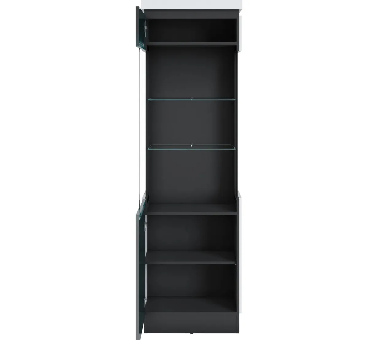 Glas und Holzwerkstoff vereinen sich in der modernen Vitrine Campania zu einem stilvollen Ensemble, das jeden Raum aufwertet. Die elegante Kombination aus alpinweiß-anthrazit und Glas verleiht diesem Möbelstück eine zeitgemäße Ästhetik. Die Drehtür ermöglicht einen einfachen Zugang zu den zwei Glaseinlegeböden, auf denen Sie Ihre Lieblingsstücke gekonnt in Szene setzen können.