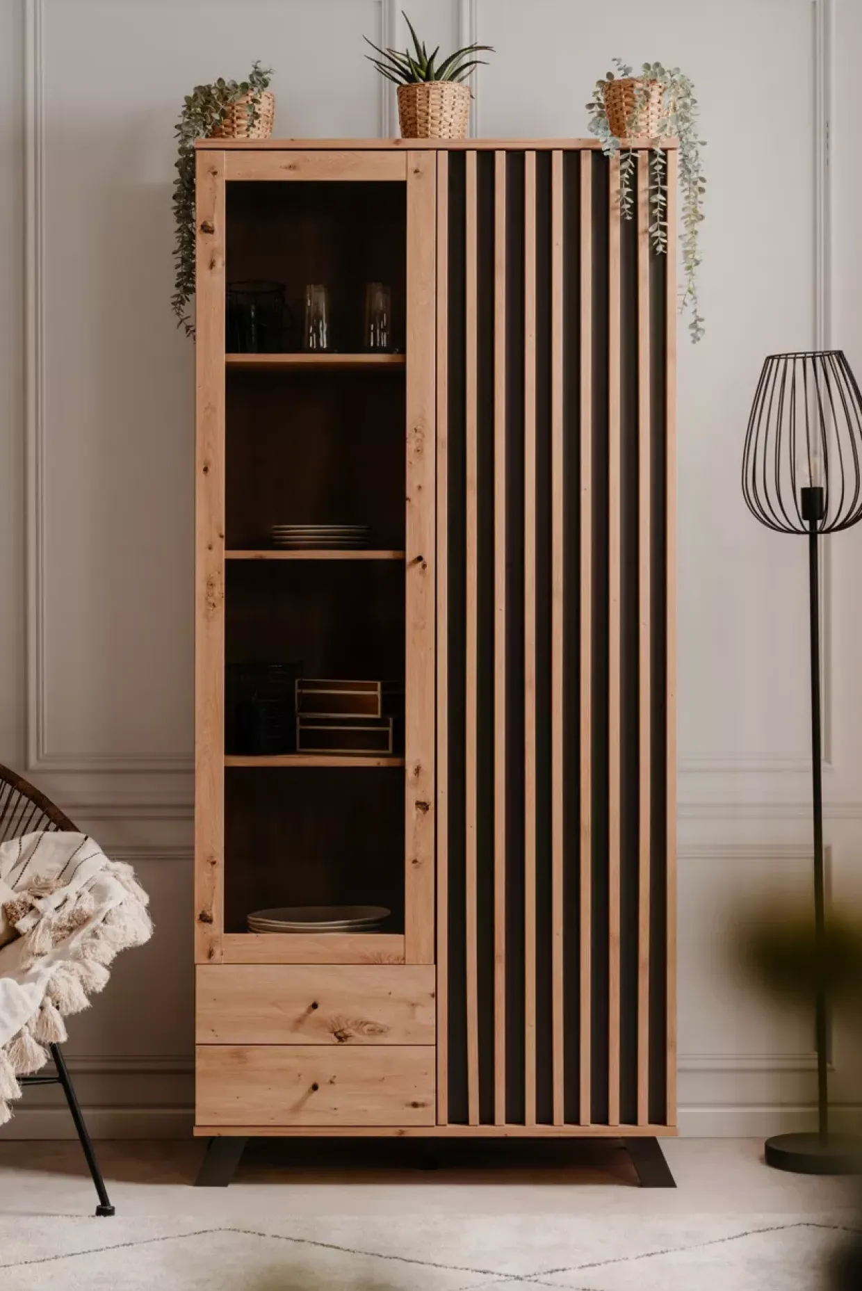 Eine harmonische Verbindung aus Funktionalität und ästhetischem Design bietet die Medan Vitrine im angesagten Japandi-Stil. Die Kombination aus Artisan Eiche Nachbildung und schwarzen Akzenten verleiht diesem Möbelstück eine zeitlose Eleganz. Zwei Türen und zwei Schubladen bieten ausreichend Stauraum für Ihre wertvollen Gegenstände und ermöglichen eine aufgeräumte Präsentation.