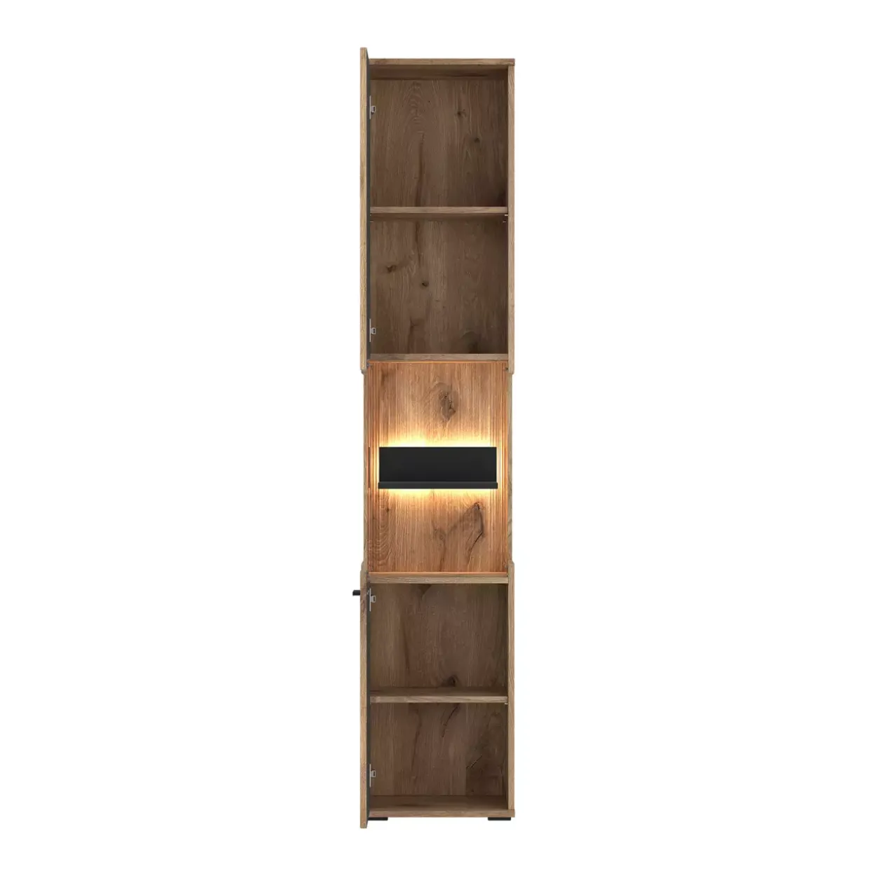 Eiche trifft auf modernes Design: Die Pardoo Vitrine präsentiert sich in einem stilvollen Eiche/PVC-Anthrazit-Finish. Diese harmonische Kombination aus Glas und Holzwerkstoff macht sie zu einem Blickfang in jedem Wohnraum. Die Vitrine besticht nicht nur durch ihre optische Eleganz, sondern auch durch die durchdachte Materialwahl. Glasfronten sorgen für eine klare Sicht auf Ihre Ausstellungsstücke, während der Holzwerkstoff für Stabilität und Langlebigkeit steht.Ein besonderes Highlight ist die integrierte Beleuchtung, die Ihre Schätze ins rechte Licht rückt und für eine einladende Atmosphäre sorgt. Diese Funktion betont die ästhetische Gestaltung und schafft eine angenehme Raumatmosphäre, die zum Verweilen einlädt. Die Vitrine ist mehr als nur ein Möbelstück; sie bietet eine Bühne für Ihre Lieblingsstücke.Der moderne Stil fügt sich nahtlos in zeitgemäße Wohnkonzepte ein und ergänzt sowohl minimalistische als auch ausgefallene Einrichtungsstile. Mit ihrer klaren Linienführung und der hochwertigen Verarbeitung wird sie schnell zum Herzstück Ihres Wohnzimmers. Die Pardoo Vitrine ist eine ideale Wahl für alle, die Wert auf Design und Funktionalität legen und dabei nicht auf Qualität verzichten möchten.