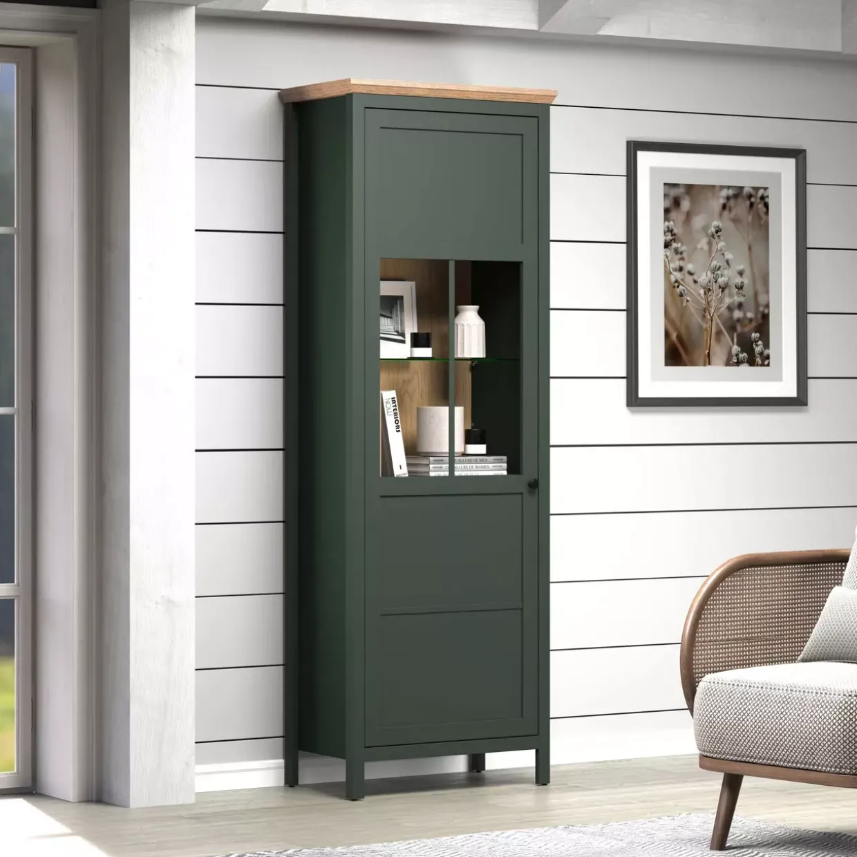 Ein Hauch von Natur zieht mit dem tiefen Tannengrün dieser eleganten Vitrine in Ihr Zuhause ein. Die Stanton Vitrine vereint Tradition und Moderne im charmanten Cottage-Stil und schafft so eine warme, einladende Atmosphäre. Mit der Absetzung in Evoke Eiche wird eine angenehme, natürliche Note hinzugefügt, die sich harmonisch in verschiedene Einrichtungsstile einfügt.