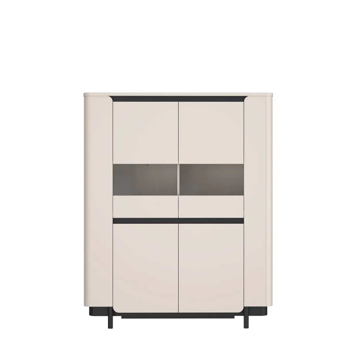 Sandfarbene und schwarze Akzente verleihen dem modernen Vodol Vitrinen-Highboard eine stilvolle Eleganz. Eine Kombination aus diesen beiden Farben sorgt für eine harmonische und zeitlose Ästhetik, die sich nahtlos in jedes moderne Wohnkonzept einfügt. Das Design überzeugt durch klare Linien und eine schlichte Formensprache, die dem Raum eine ruhige und aufgeräumte Atmosphäre verleihen.