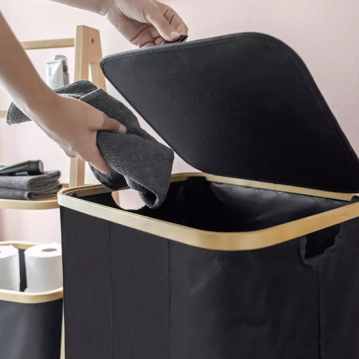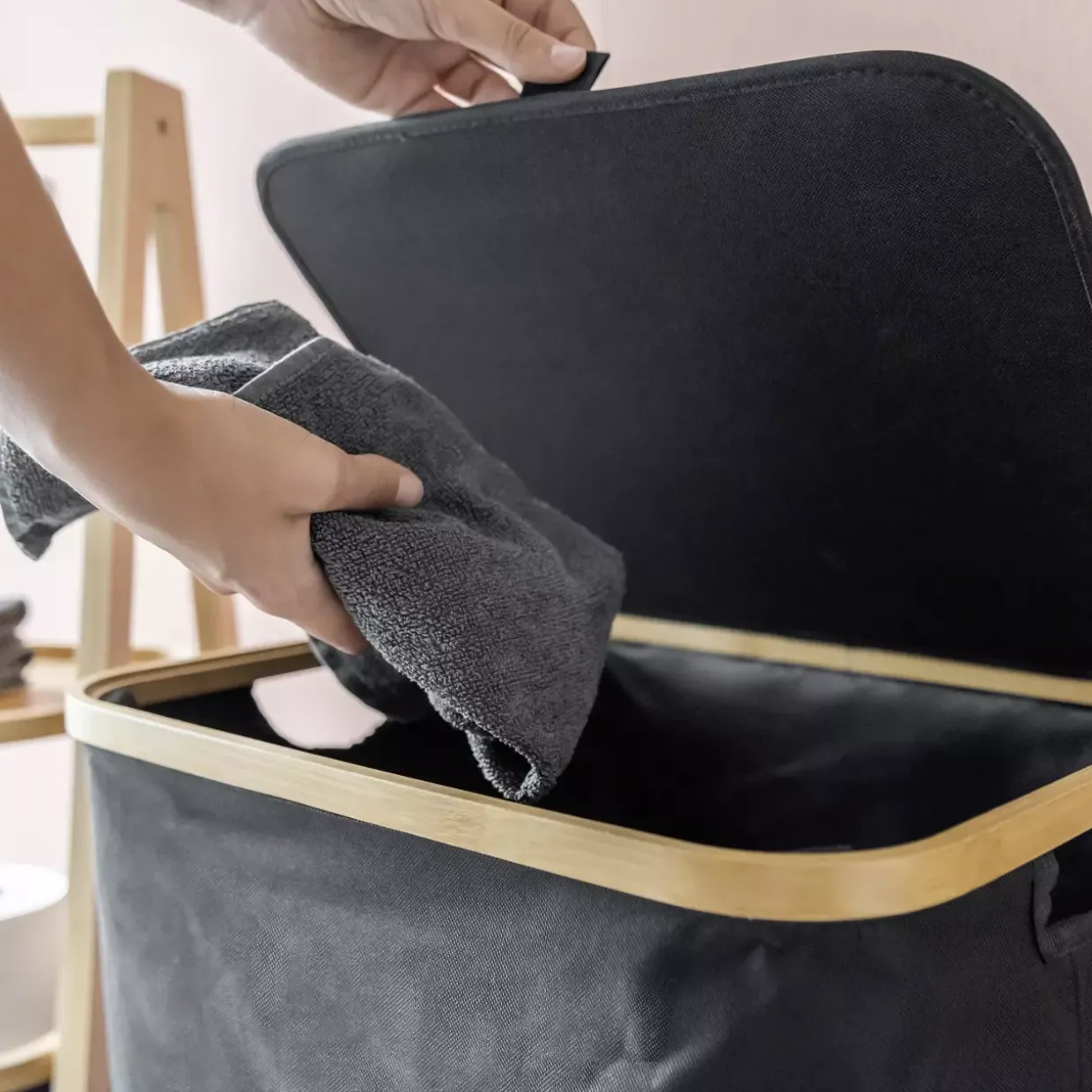 Ein natürlicher Rahmen aus Bambus erstreckt sich elegant um die Wäschetruhe Ecori und verleiht ihr einen modernen Touch. Diese stilvolle Aufbewahrungslösung kombiniert die warme Ausstrahlung von Bambusholz mit der Funktionalität von Synthetikfasern. Der schwarze Wäschesack aus robustem Kunststoff fügt dem Design eine zeitlose Ästhetik hinzu und bietet gleichzeitig eine langlebige Nutzung.