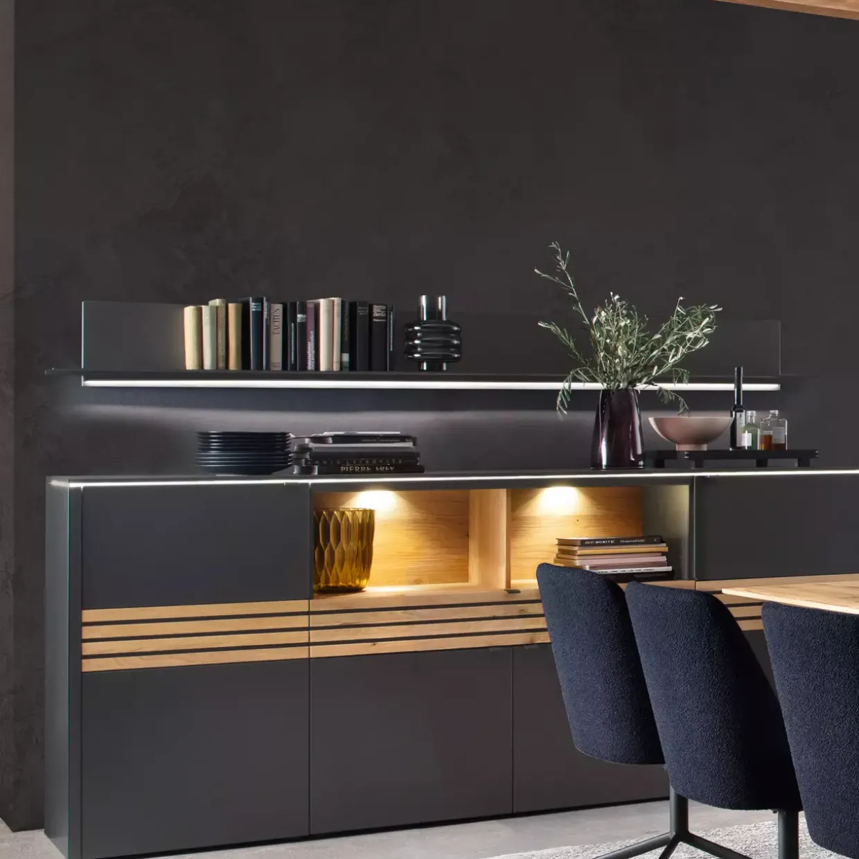 Lack in anthrazit matt verleiht dem Game Wand-Paneel einen zeitgemäßen und eleganten Look. Die Kombination aus Holz und Metall sorgt nicht nur für Stabilität, sondern auch für eine interessante Materialästhetik, die in modernen Wohnräumen besonders gut zur Geltung kommt.
