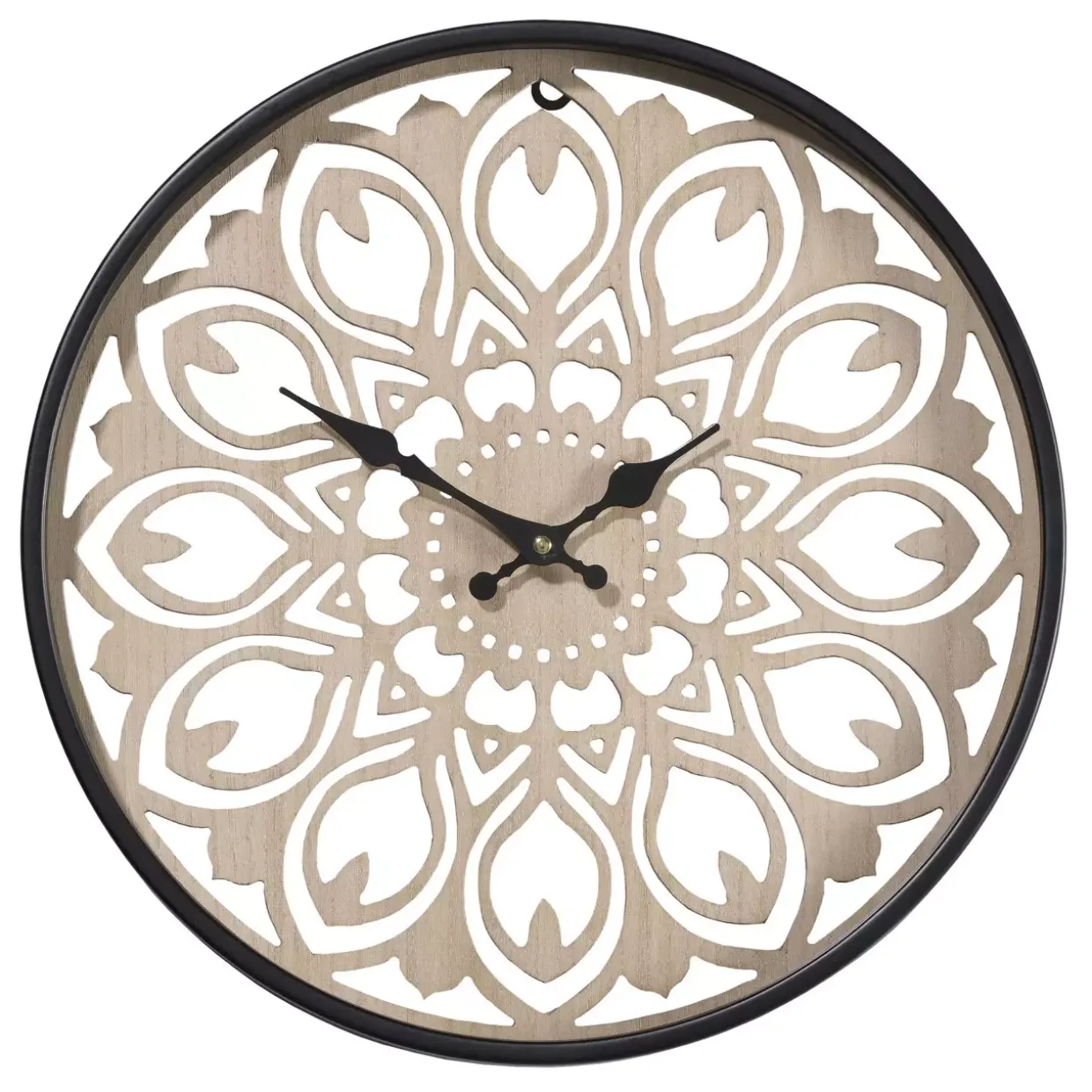 Holzfarbene Akzente kombiniert mit schwarzem Design schaffen eine angenehme Balance in Ihrem Wohnraum. Diese Wanduhr vereint die Eleganz von Glas, die Wärme von Holzwerkstoff und die Robustheit von Eisen zu einem modernen Kunstwerk an Ihrer Wand. Mit einem Durchmesser von 40 cm ist sie ein dezenter Blickfang, der sich harmonisch in verschiedene Wohnstile einfügt.