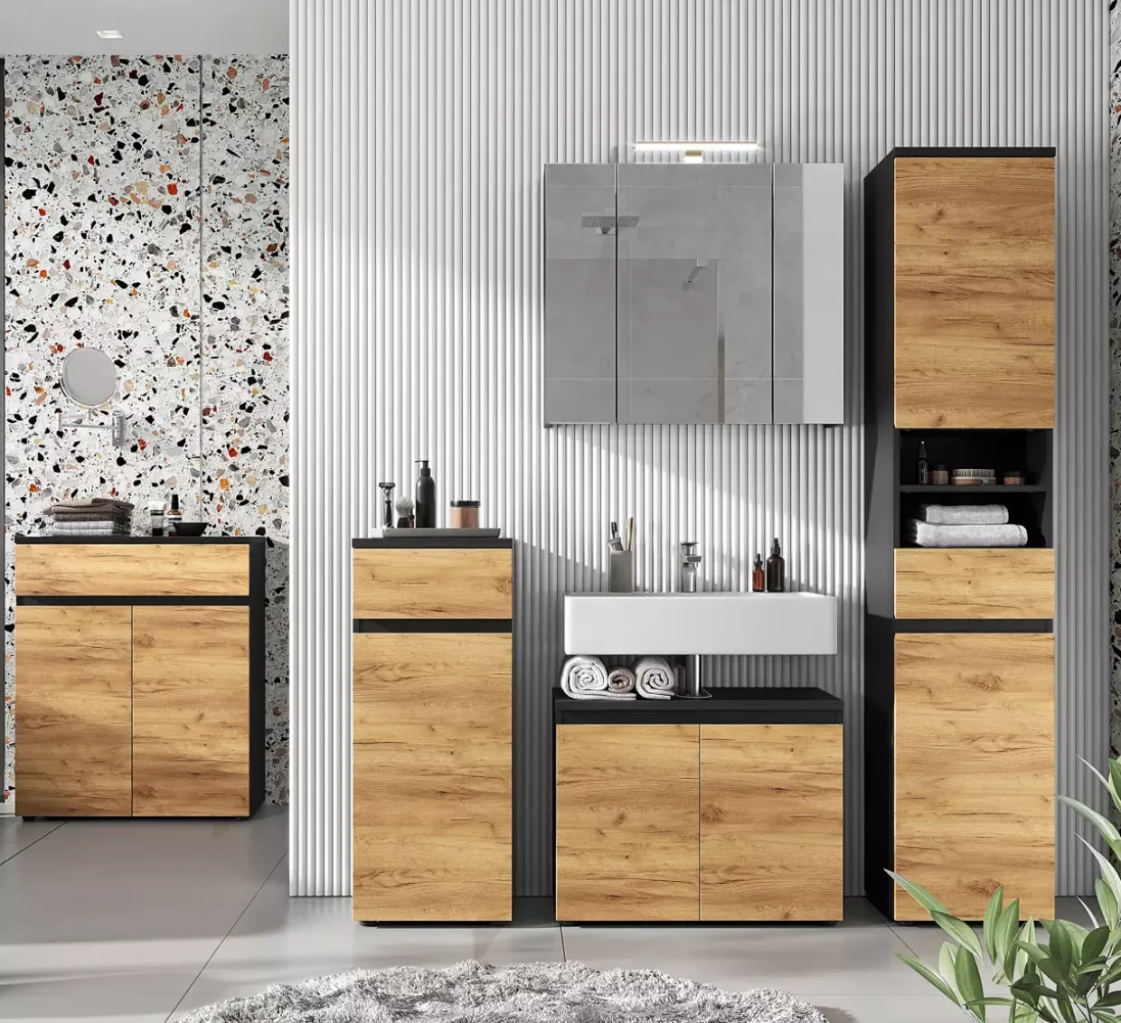 Graphitfarbene Akzente verleihen dem Waschbeckenunterschrank Mayor eine moderne Eleganz, die jedes Badezimmer aufwertet. Die Kombination aus langlebigem Holzwerkstoff und robustem Metall spiegelt nicht nur Stil, sondern auch Funktionalität wider. Mit seinen Maßen von 70 x 56 x 34 cm bietet der Unterschrank reichlich Stauraum, um Ordnung in Ihrem Badezimmer zu schaffen. Die Drehtür mit Push-To-Open-Funktion offenbart ein durchdachtes Innenleben, das Ihre Kosmetikartikel und Pflegeutensilien diskret versteckt.