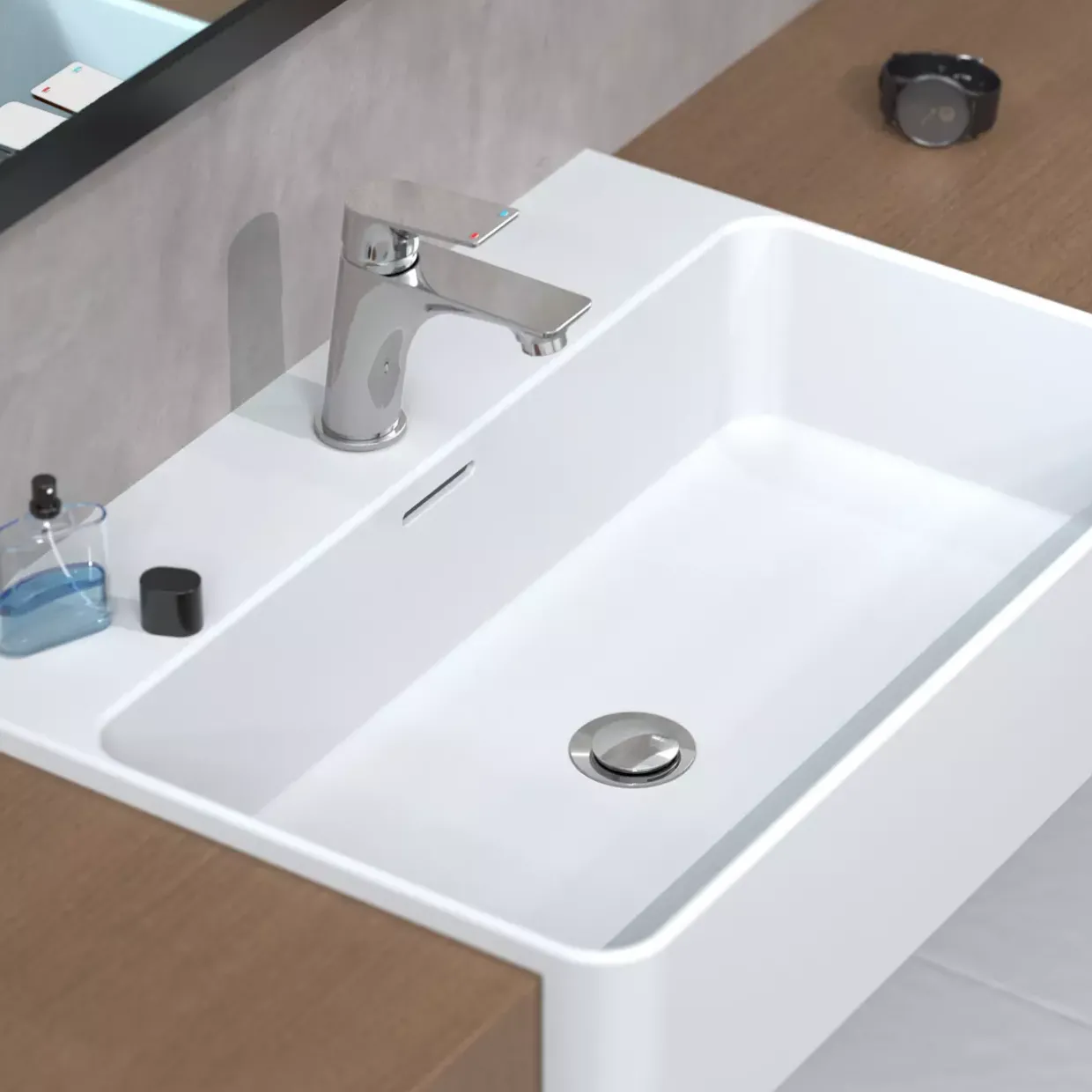 Das moderne Erscheinungsbild der Armatur fügt sich nahtlos in verschiedene Badezimmereinrichtungen ein, während die Chromoberfläche einen Hauch von Luxus verleiht. Die Materialwahl garantiert Langlebigkeit und eine einfache Reinigung, was den Pflegeaufwand minimiert und die Armatur stets wie neu aussehen lässt.