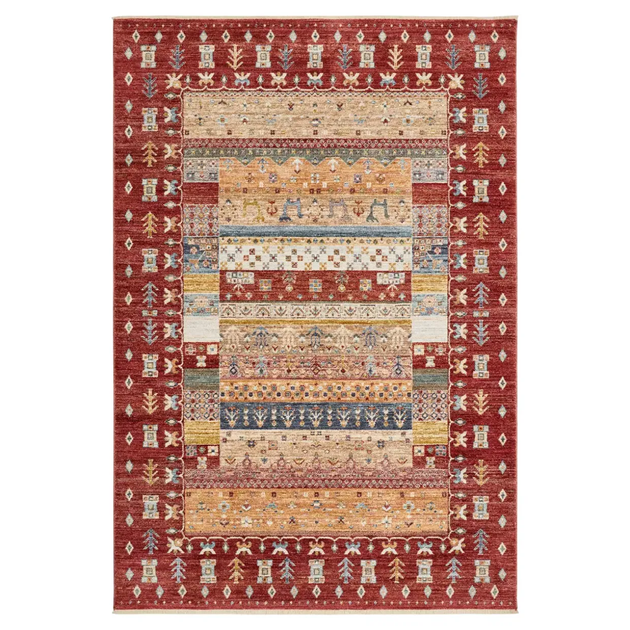 Ein rechteckiger Teppich kann jedem Raum Struktur verleihen. Der konventionelle Stil des Teppichs Rocco verbindet traditionelle Eleganz mit modernen Akzenten. In leuchtenden Rot Multi-Farbkombinationen gehalten, setzt er farbliche Akzente, die jeden Raum beleben. Hergestellt aus hochwertigem Textil, überzeugt dieser Webteppich durch seine Langlebigkeit und Pflegeleichtigkeit. Die Synthetikfaser bietet nicht nur ein angenehmes Laufgefühl, sondern ist auch besonders strapazierfähig.Rocco ist mehr als nur ein Teppich; er ist ein vielseitiges Wohnaccessoire, das sich den unterschiedlichsten Einrichtungsstilen anpasst. Egal, ob als Highlight im Wohnzimmer, als wärmender Akzent im Schlafzimmer oder als Spielunterlage im Kinderzimmer, Rocco erfüllt viele Funktionen in Ihrem Zuhause. Der Teppich ist zudem für die Nutzung mit Fußbodenheizung geeignet, was in den kalten Monaten zusätzliche Behaglichkeit garantiert.Ein weiteres Plus: Die Pflege gestaltet sich denkbar einfach. Regelmäßiges Staubsaugen hält Staub und Schmutz fern, während kleinere Flecken mit einem feuchten Tuch leicht zu entfernen sind. Nach Öko-Tex Standard 100 schadstoffgeprüft, bietet er zudem ein hohes Maß an Sicherheit und Hautfreundlichkeit. Rocco vereint Funktionalität und Design auf eindrucksvolle Weise.