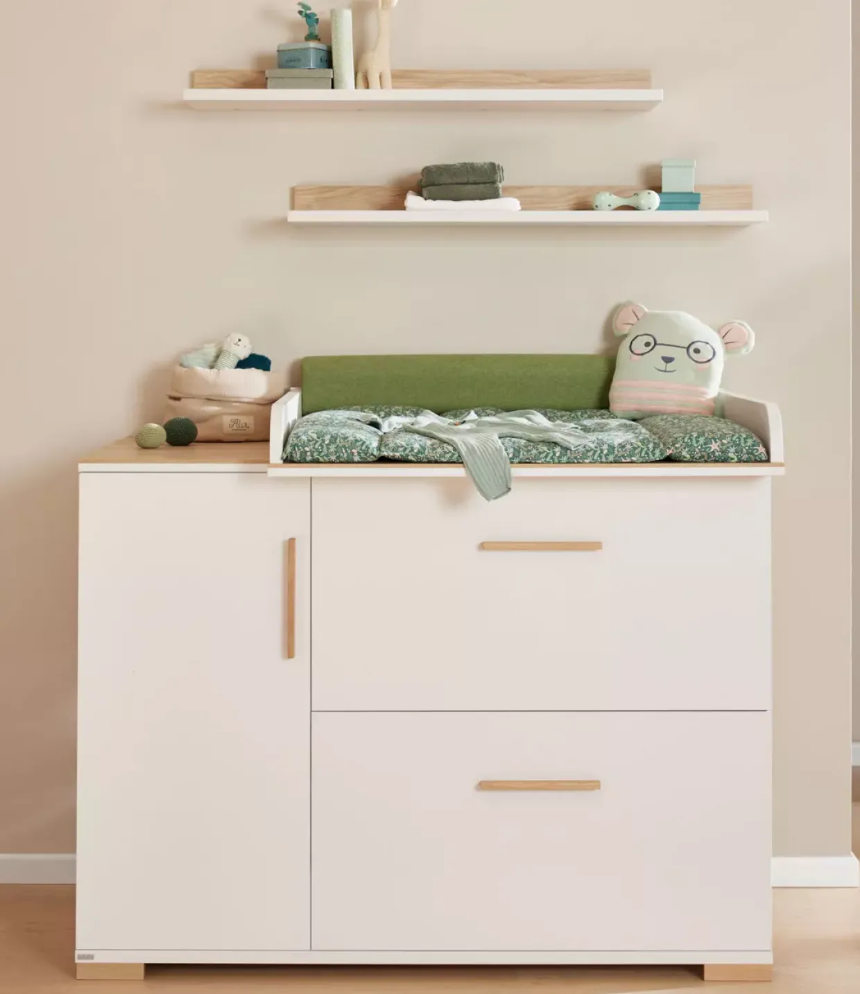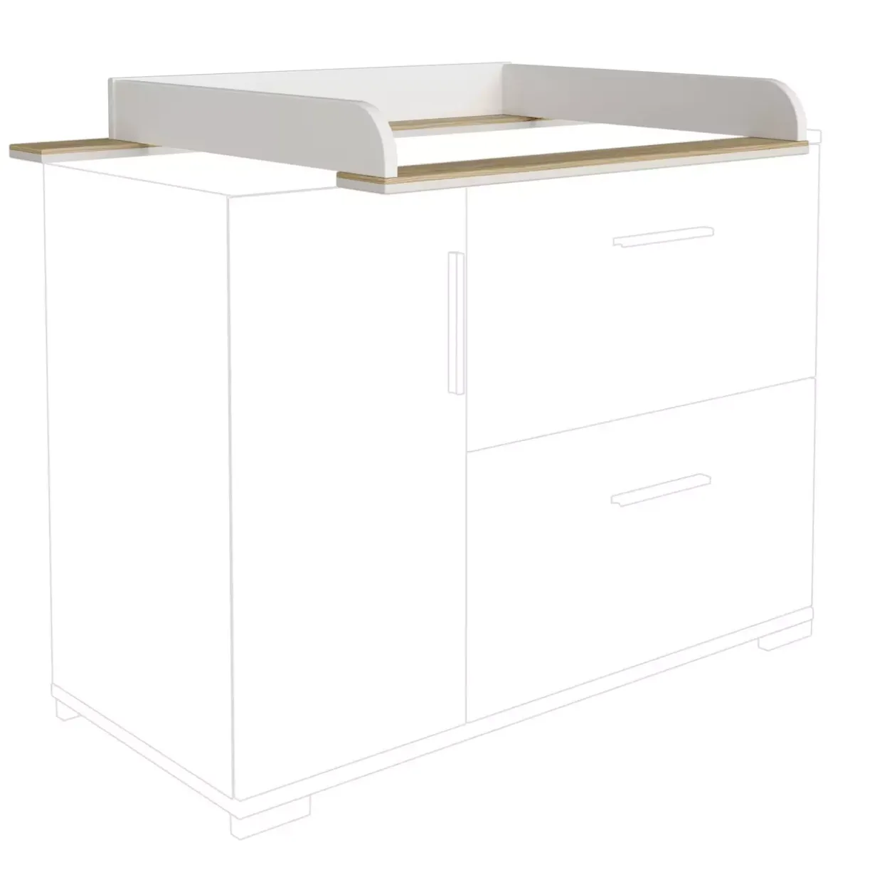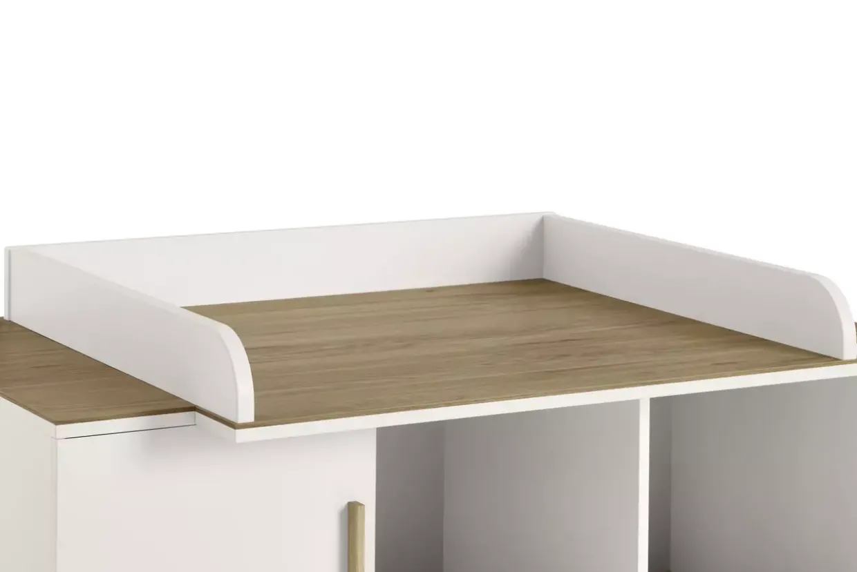 Der Wickelaufsatz ENIE überzeugt durch seine flexible Montage. Ob rechts, links oder mittig – Sie entscheiden, welche Position am besten zu Ihren Bedürfnissen passt. Diese Vielseitigkeit macht ihn zu einer praktischen Ergänzung in jedem Kinderzimmer.