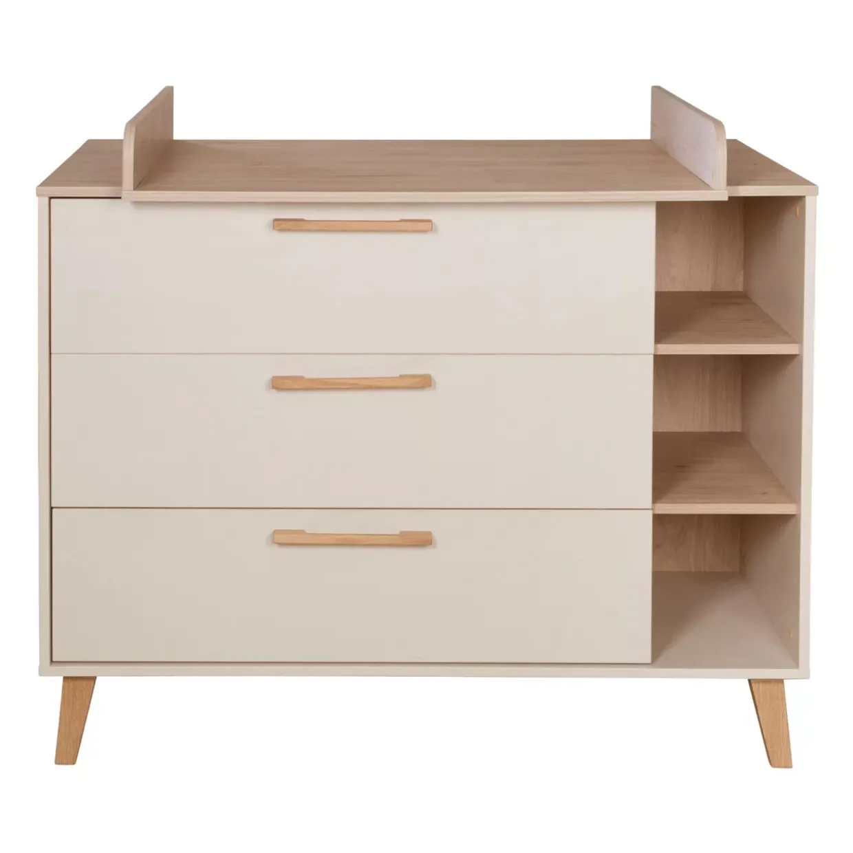 Ein wahres Highlight dieser Wickelkommode ist der flexibel montierbare Wickelansatz, der rechts, mittig oder links angebracht werden kann. Die Kombination aus Cashmere und Virginia Chestnut verleiht dem Möbelstück eine elegante, skandinavische Note. Gefertigt aus Holzwerkstoff und echtem Holz, bietet die Kommode nicht nur Stabilität, sondern auch eine ansprechende Optik.