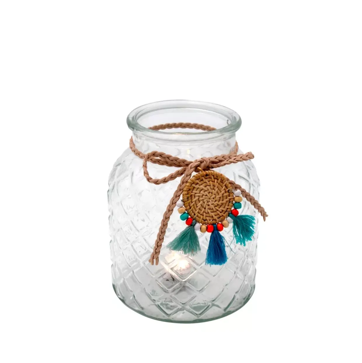 Die Kombination aus Glas und Textil verleiht diesem Windlicht eine einzigartige Ästhetik, die sowohl modern als auch zeitlos wirkt. Das klare Glas bietet eine perfekte Bühne, um das sanfte Flackern einer Kerze besonders zur Geltung zu bringen. Durch die neutralen Farben, die in Weiß und Türkis gehalten sind, fügt sich das Windlicht harmonisch in verschiedene Wohnstile ein und sorgt für eine entspannte Atmosphäre.