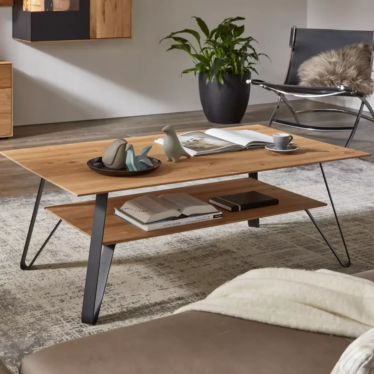 Der Varedo Couchtisch vereint die Eleganz von Loft-Design mit der Robustheit von Metall und Holz. Metall in carbonfarbiger Pulverbeschichtung bildet eine stabile Basis und verleiht dem Tisch einen modernen, industriellen Charakter. Gleichzeitig sorgt die massive Wildeiche, sanft gebürstet, für eine warme und einladende Note, die in jedem Wohnraum harmonisch wirkt.