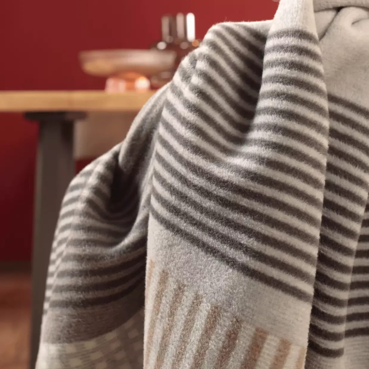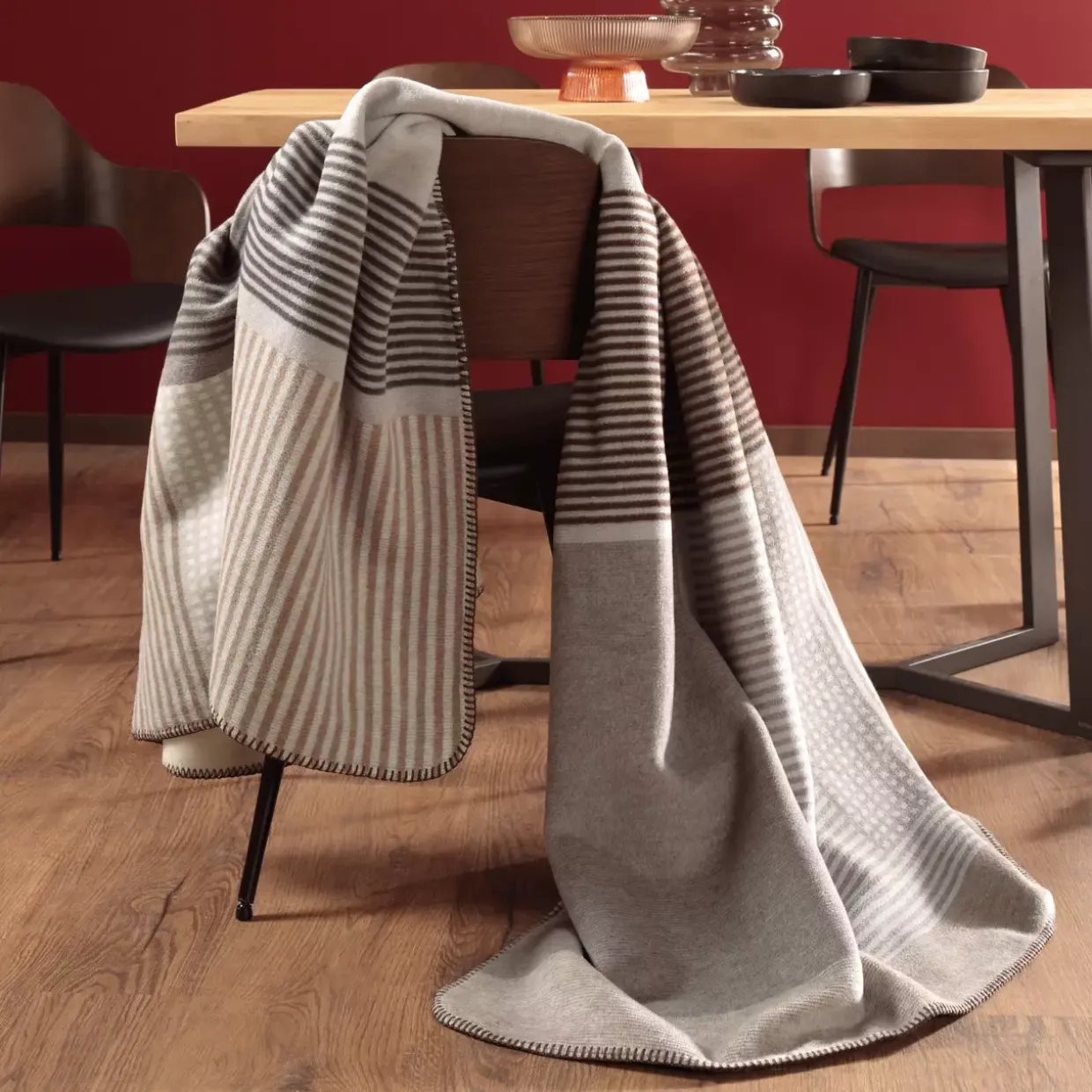 Sanfte, hügelige Landschaften entfalten sich auf der Wohndecke in der Farbe Iceland Horizon. Ein Design, das Ruhe und Geborgenheit schenkt, während gedämpfte Töne wie Blau, Hellbraun und Grün eine entspannende Atmosphäre schaffen. Die rechteckige Form harmoniert perfekt mit modernen Wohnräumen und lässt sich vielseitig einsetzen. Gefertigt aus einer hochwertigen Baumwollmischung, überzeugt das Textilmischgewebe nicht nur durch seinen Komfort, sondern auch durch seine pflegeleichten Eigenschaften. Die Jacquard-Webart verleiht der Decke eine besondere Struktur, die das Streifenmuster elegant zur Geltung bringt. Ob als stilvolle Sofadecke oder als wärmender Begleiter an kühlen Abenden – diese Wohn- und Heimdecke ist in zwei Größen erhältlich und vielseitig einsetzbar. Die anschmiegsame Textur lädt dazu ein, sich hineinzukuscheln und den Alltag einen Moment hinter sich zu lassen. Bei der Pflege ist auf folgende Hinweise zu achten: Maschinenwäsche bis 30°C im Schonwaschgang, keine Bleichmittel verwenden und nicht bügeln. Eine schonende Reinigung mit Perchlorethylen wird empfohlen, um die Qualität der Decke zu erhalten. Ein Stück, das Ästhetik und Funktionalität in moderner Eleganz vereint. Erleben Sie die sanfte Berührung und die einladende Optik dieses Wohnaccessoires.