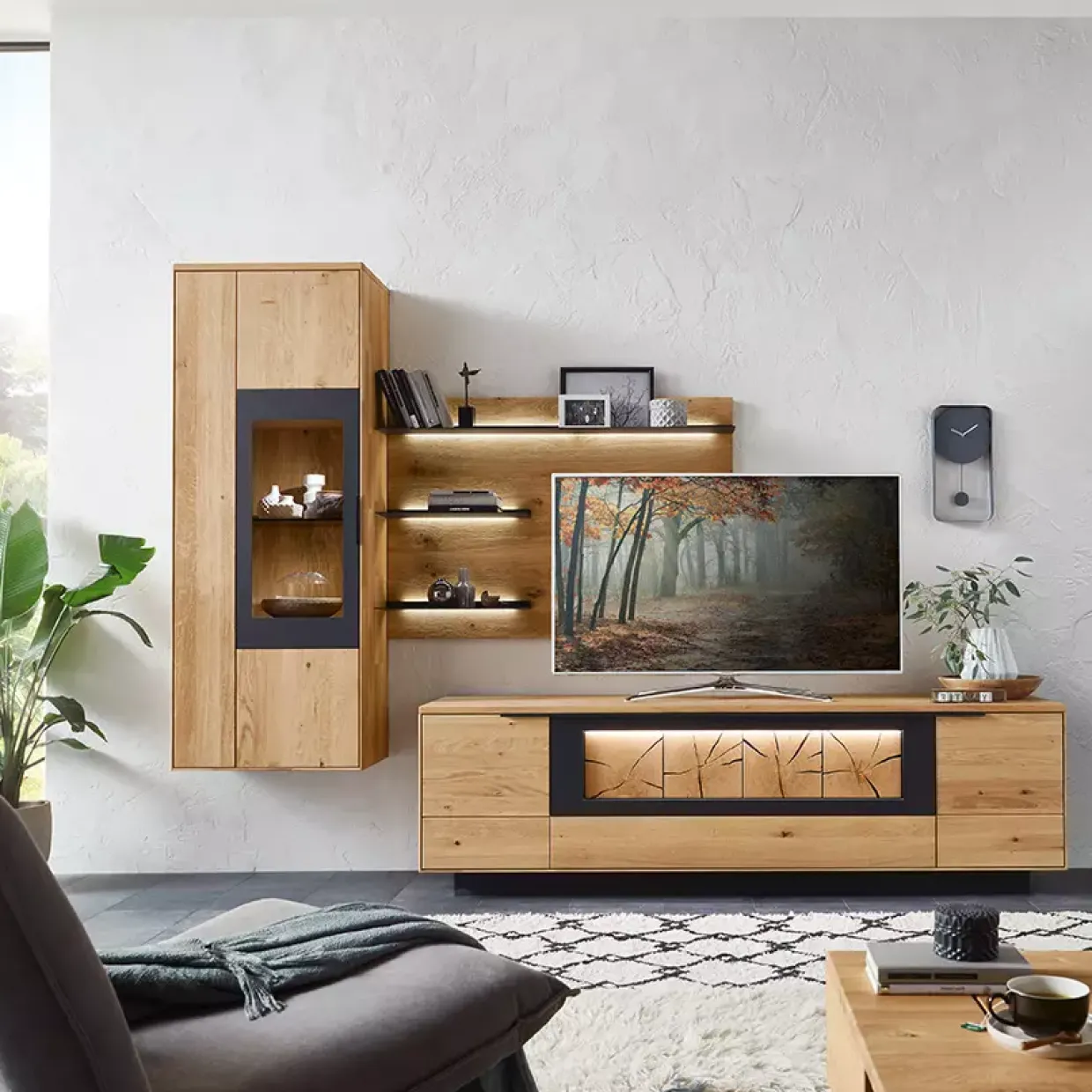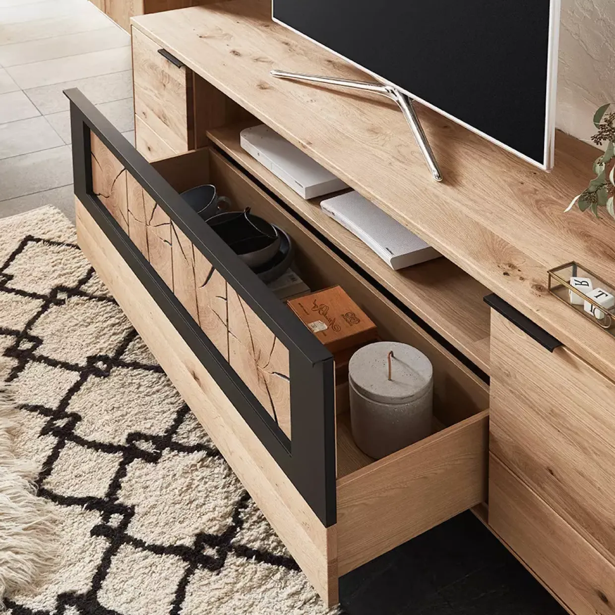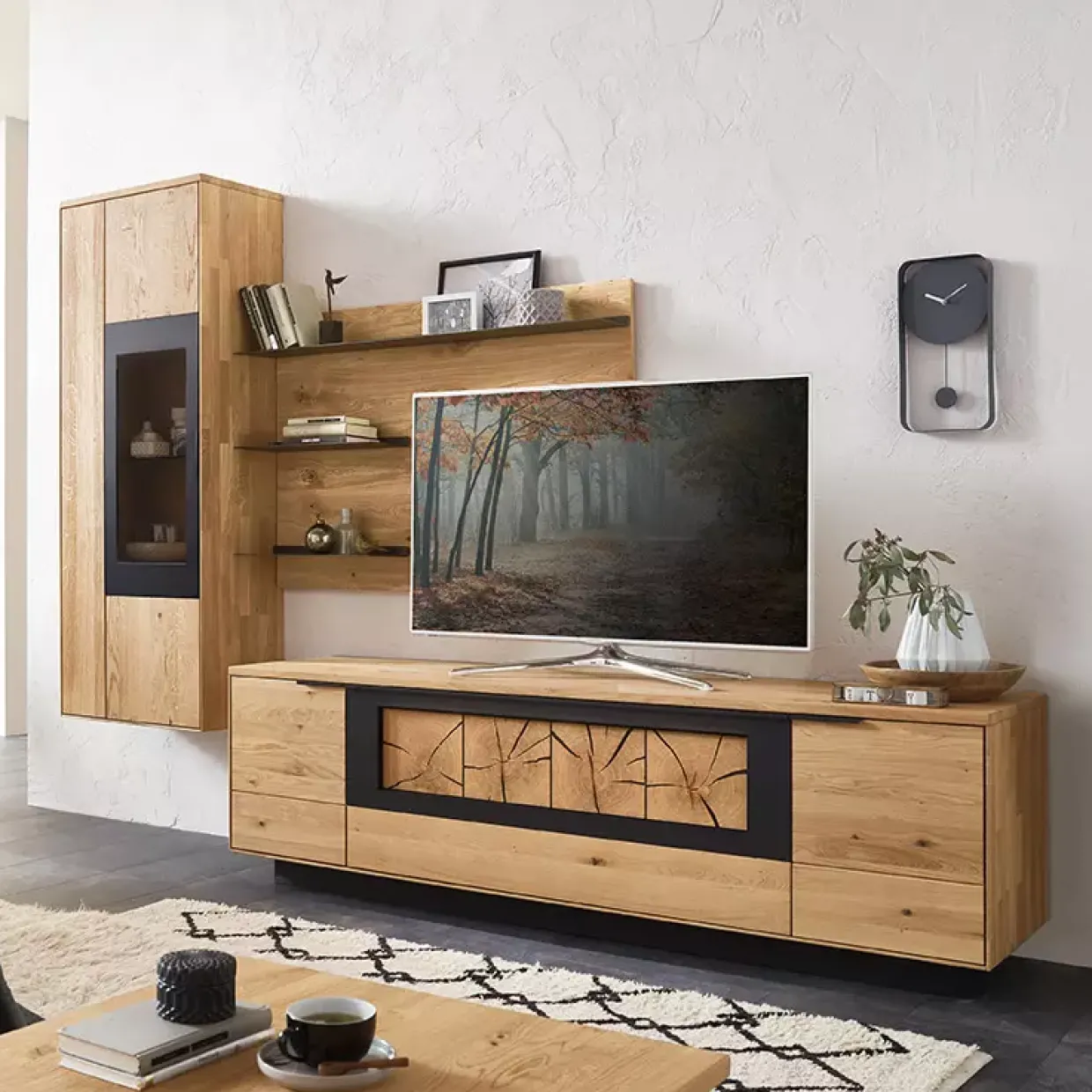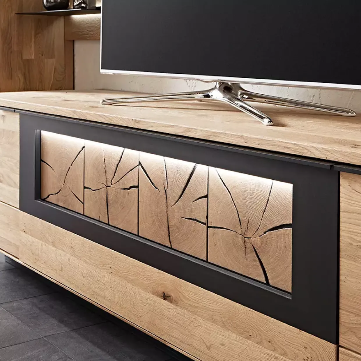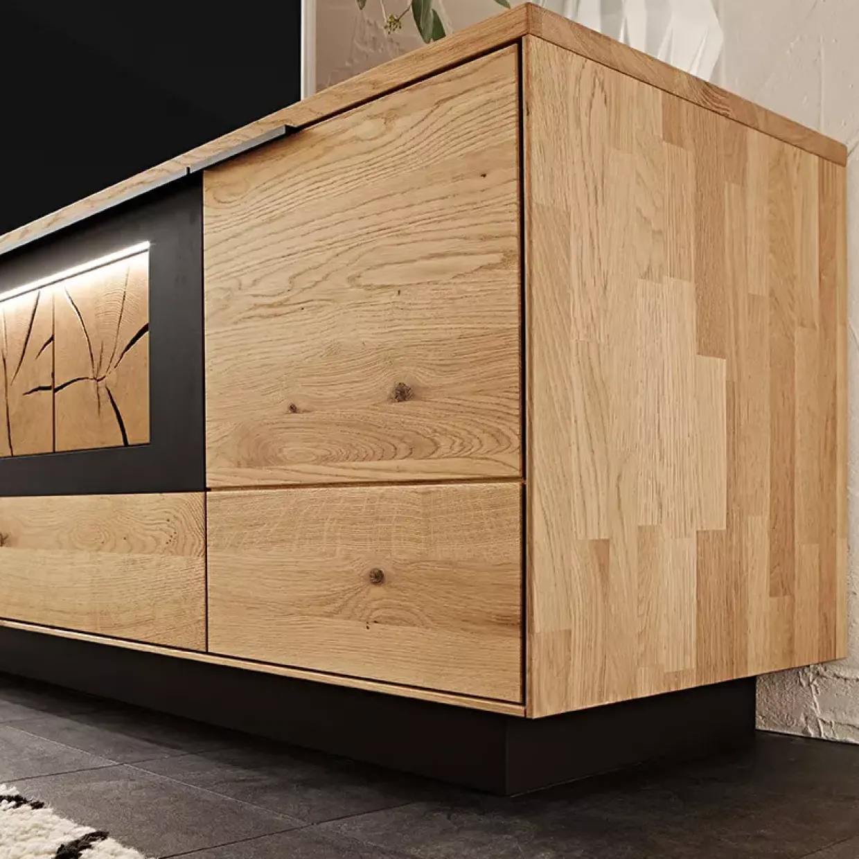 Die Wohnkombination bietet durch die akzentuierte Hirnholz-Scheibe auf einer schwarzen Holzwerkstoffplatte eine besondere Note. Holzwerkstoffe, die carbonfarbig strukturlackiert sind, runden das Gesamtbild ab und machen das Möbelstück zu einem Highlight in jedem Wohnraum.