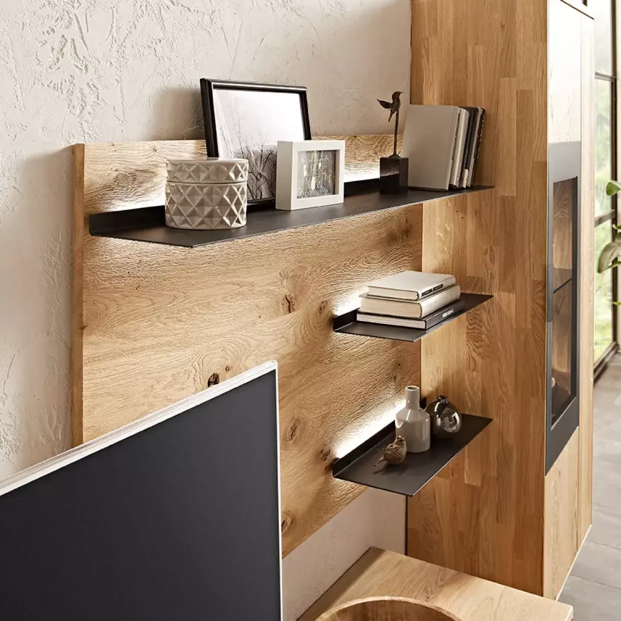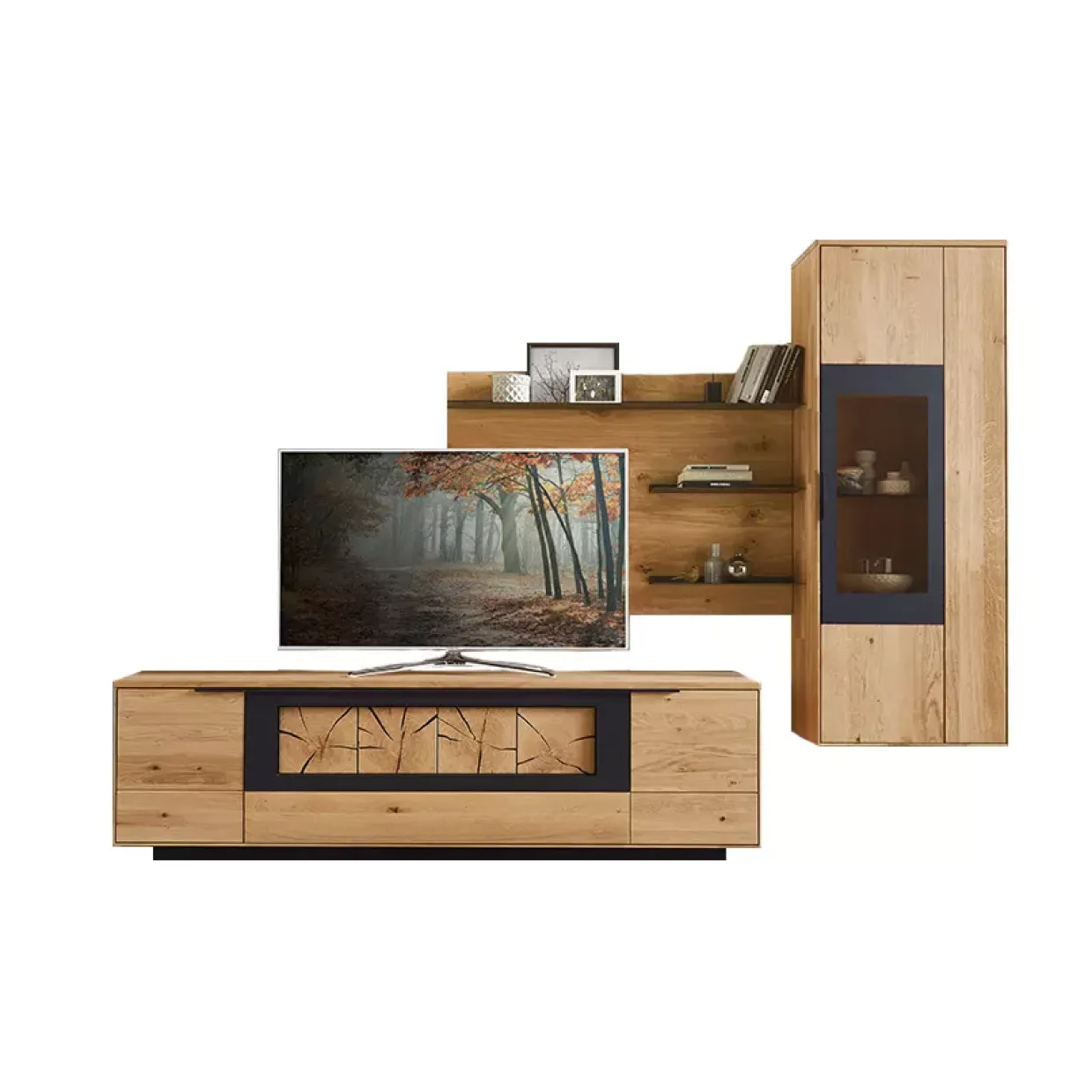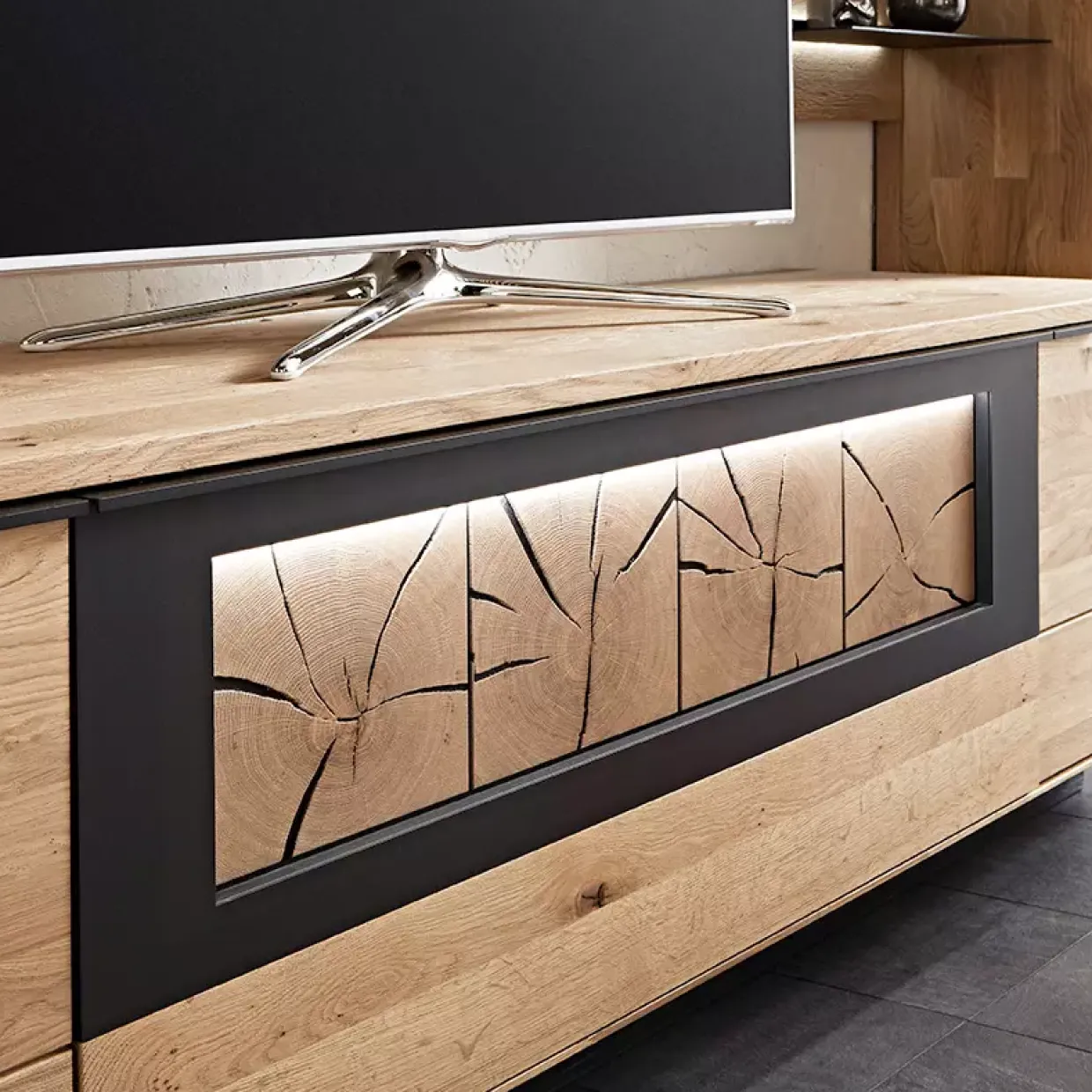 Massive, soft gebürstete Wildeiche verleiht der Wohnkombination Cortona eine zeitlose Eleganz, die sich harmonisch in moderne Wohnräume einfügt. Drei Drehtüren bieten großzügigen Stauraum und bestechen durch ihre gedämpfte und langlebige Beschlagstechnologie, die einen leisen und sanften Schließvorgang garantiert. Die Kombination aus Holz und metallischen Akzenten, wie den carbonfarbig strukturgepulverten Metallteilen, sorgt für eine stilvolle und robuste Struktur.