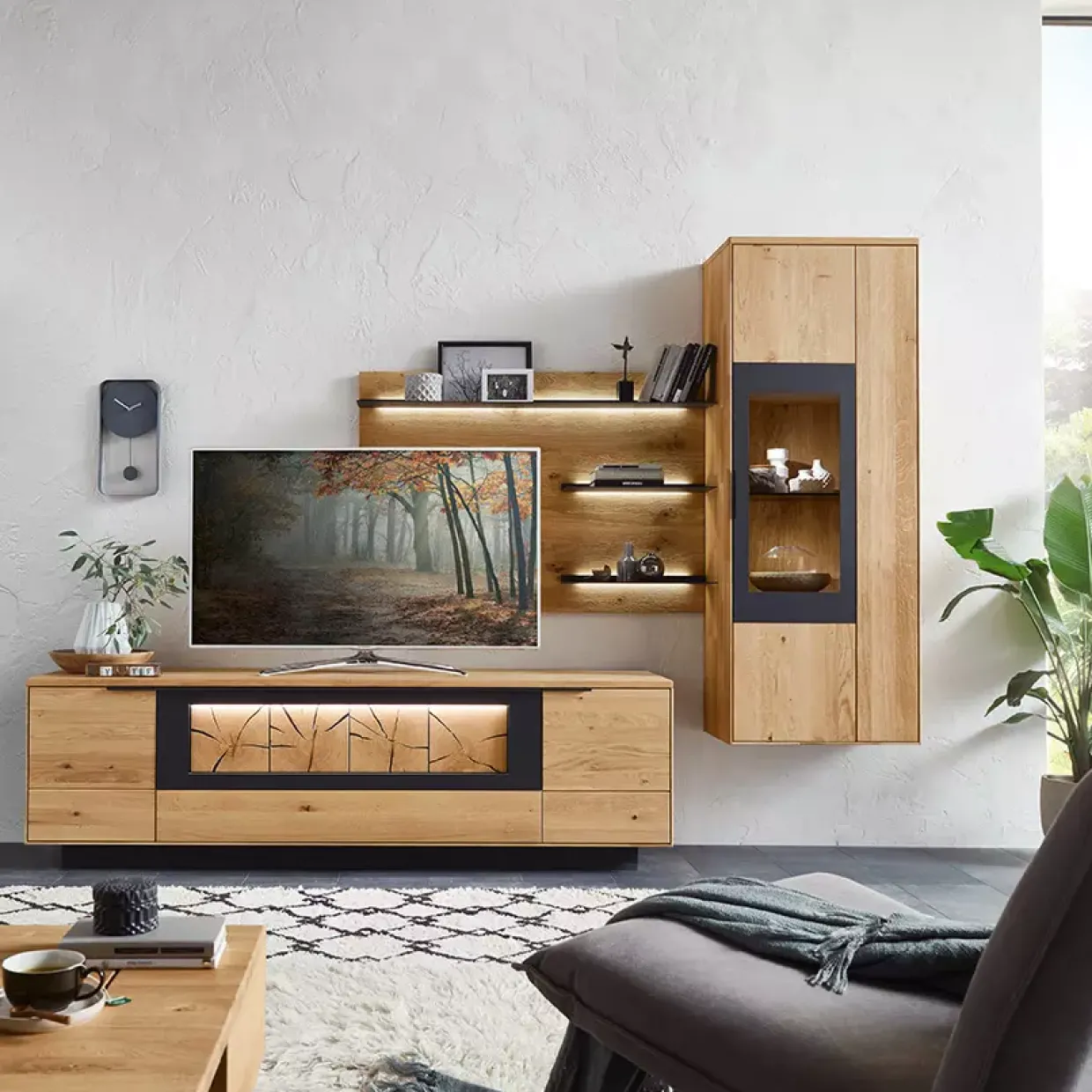 Auf Wunsch kann eine LED-Beleuchtung integriert werden, um die Wohnkombination in ein stimmungsvolles Licht zu tauchen. Diese Option ist gegen einen Mehrpreis erhältlich und unterstreicht die Vielseitigkeit des Modells. Die Natur-Effekt-Lackoberfläche sorgt für eine dauerhaft schützende und pflegeleichte Oberfläche, die den täglichen Anforderungen gewachsen ist. Ergonomische Griffprofile runden das Design ab und bieten eine angenehme Handhabung. Die Cortona Wohnkombination vereint Funktionalität mit ästhetischem Anspruch und wird so zum Highlight in jedem Wohnraum.
