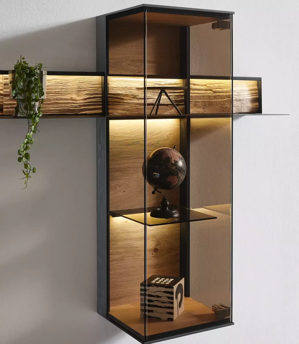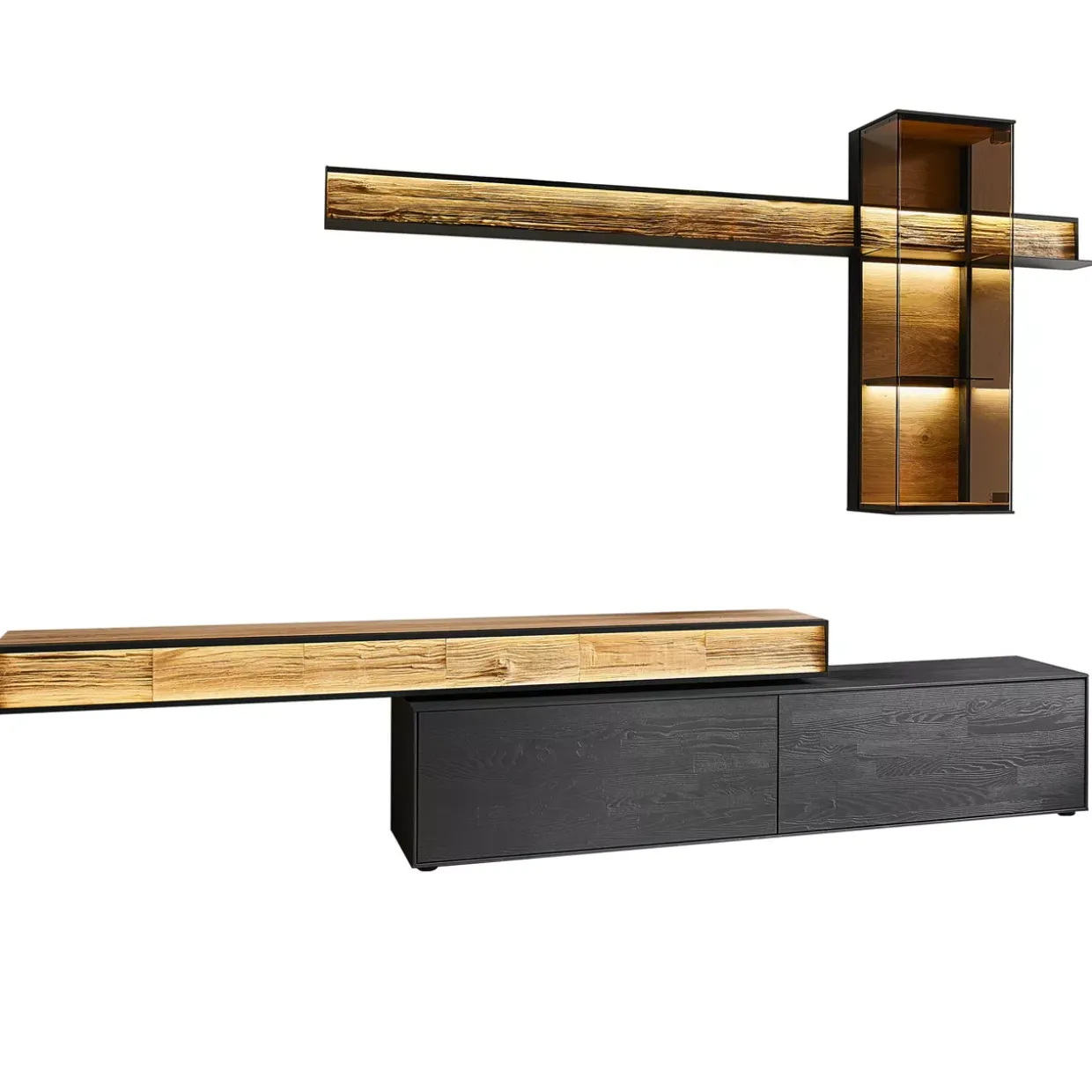 Betonen Sie Ihre Wohnlandschaft mit der Hängevitrine, die durch einen Glas- und einen Metallboden sowie eine weitere Spaltholzapplikation hervorsticht. Jedes Element dieser Wohnkombination ist darauf ausgelegt, Ihrem Raum Struktur und Design zu verleihen.