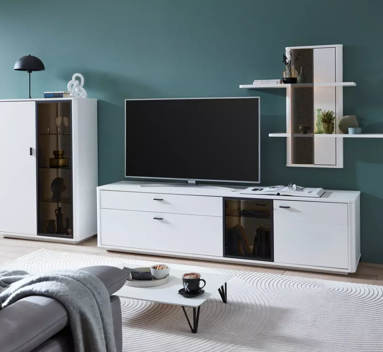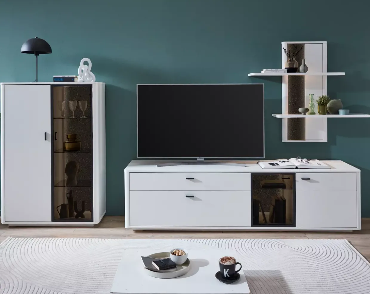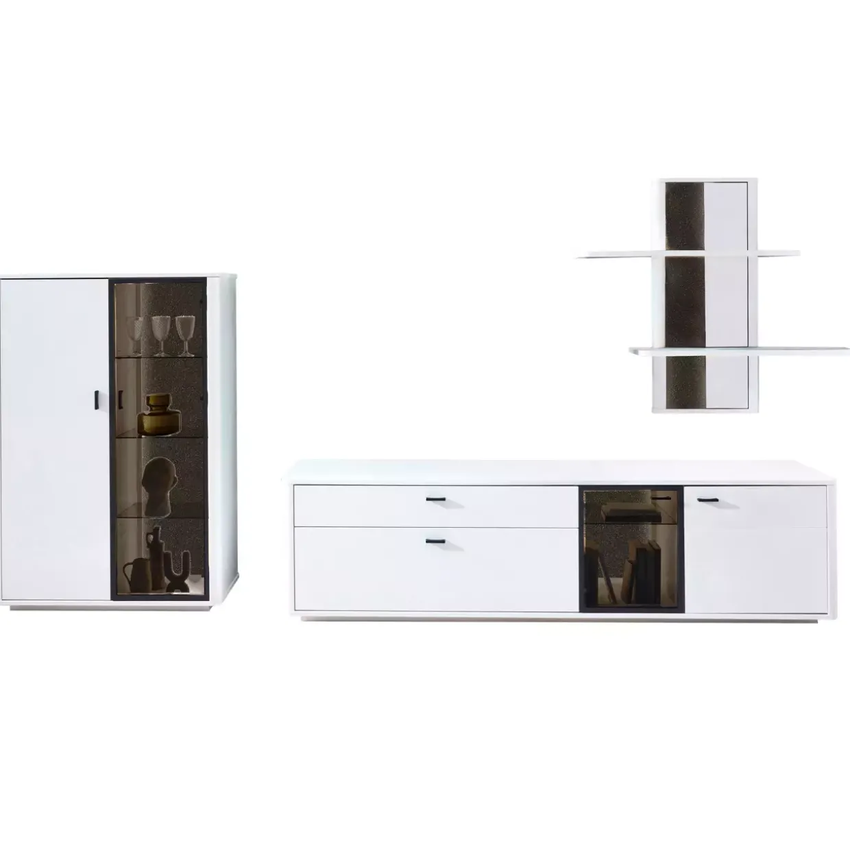 Die stilvolle Kombination aus Glas, Holzwerkstoff und Metall verleiht dieser Wohnkombination eine faszinierende Ausstrahlung. Eine harmonische Verbindung von Funktionalität und Ästhetik, die sich perfekt in jedes Wohnambiente einfügt. Das Unterteil bietet mit einer Holztür, einer Glastür, einer Klappe und einem Schubkasten viel Stauraum und ermöglicht eine übersichtliche Aufbewahrung Ihrer persönlichen Gegenstände. Ein Holzeinlegeboden sowie ein Glaseinlegeboden sorgen für zusätzliche Flexibilität und Ordnung.Das Highboard beeindruckt mit einer Holztür und einer Glastür, die den Zugang zu zwei Holzeinlegeböden und drei Glaseinlegeböden ermöglichen. Eine elegante Lösung für die Präsentation dekorativer Objekte oder die Aufbewahrung von Geschirr und Gläsern. Das Regal ergänzt die Wohnkombination durch ein Paneel und zwei Holzböden, die zusätzlichen Raum für Bücher oder andere Lieblingsstücke bieten.Besonders hervorzuheben ist die Schubkasten-Unterflurführung mit Selbsteinzug und Dämpfung, die eine leise und sanfte Bedienung ermöglicht. Die Kombination aus Weißlack, Kristallsteinabsetzung und Parsolglas verleiht dem Design eine besondere Raffinesse und passt perfekt zu einem modernen, anspruchsvollen Wohnstil. Eine Wohnkombination, die durch durchdachte Details und hochwertige Materialien besticht und Ihrem Zuhause eine exklusive Note verleiht.