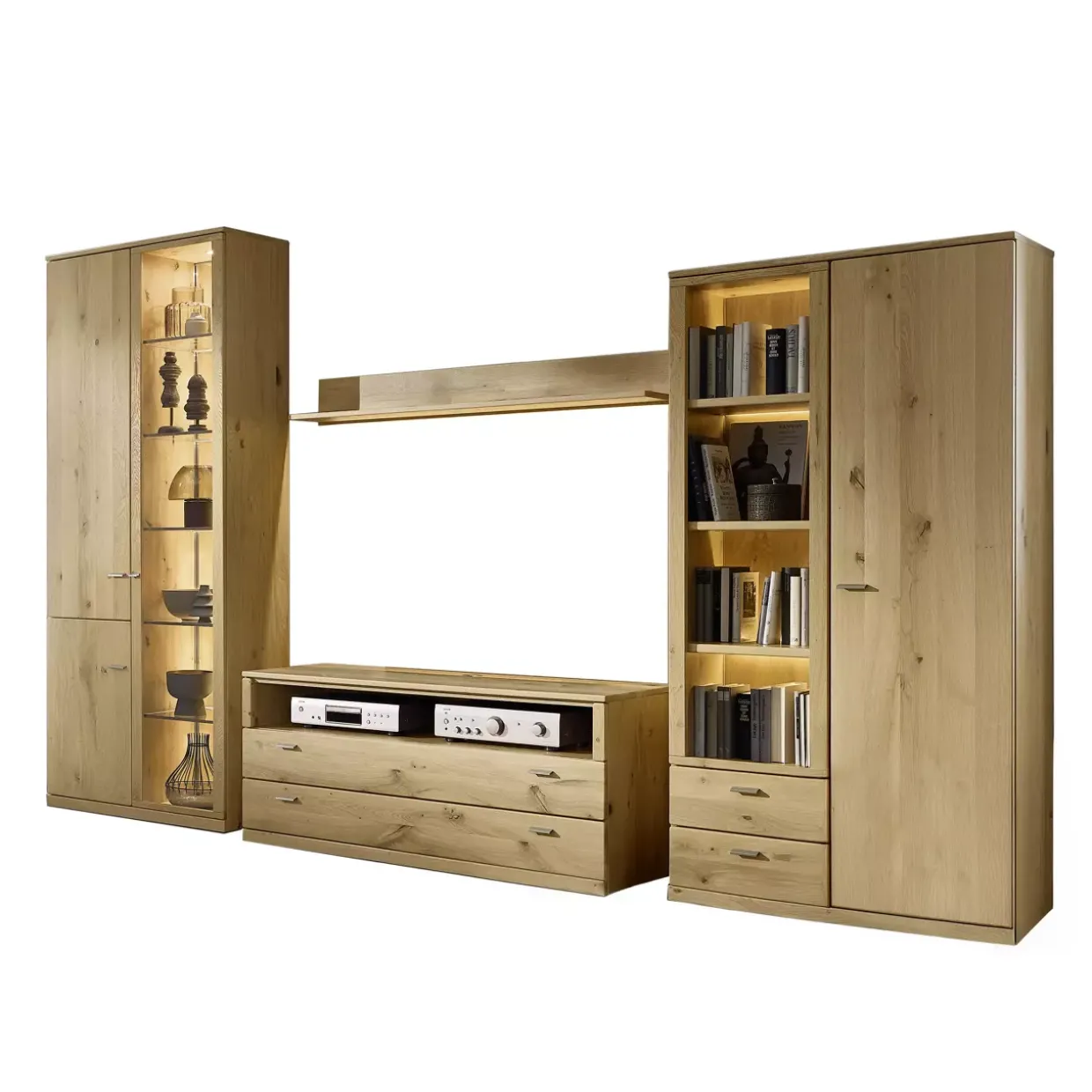 Die Kombination aus Glas, Holz und Metall macht diese Wohnwand zu einem wahren Blickfang, der moderne und natürliche Elemente harmonisch vereint. Der Einsatz von massivem und furniertem Holz in Asteiche verleiht dem Möbelstück eine zeitlose Ästhetik, die sich mühelos in verschiedene Einrichtungsstile integrieren lässt. Durch die durchdachten Details und hochwertigen Materialien wird die Wohnwand nicht nur zu einem funktionalen Möbelstück, sondern auch zu einem Design-Highlight in Ihrem Zuhause.