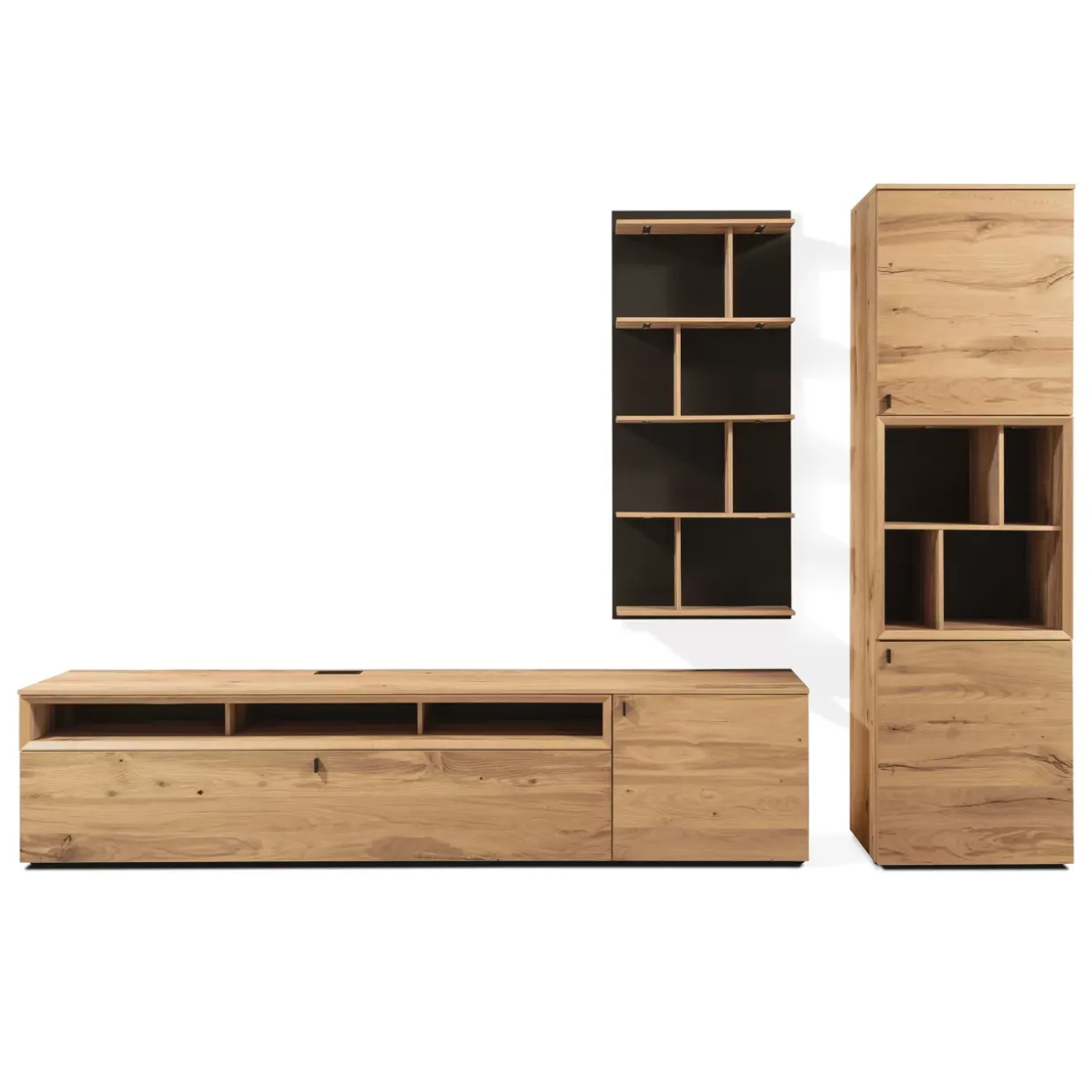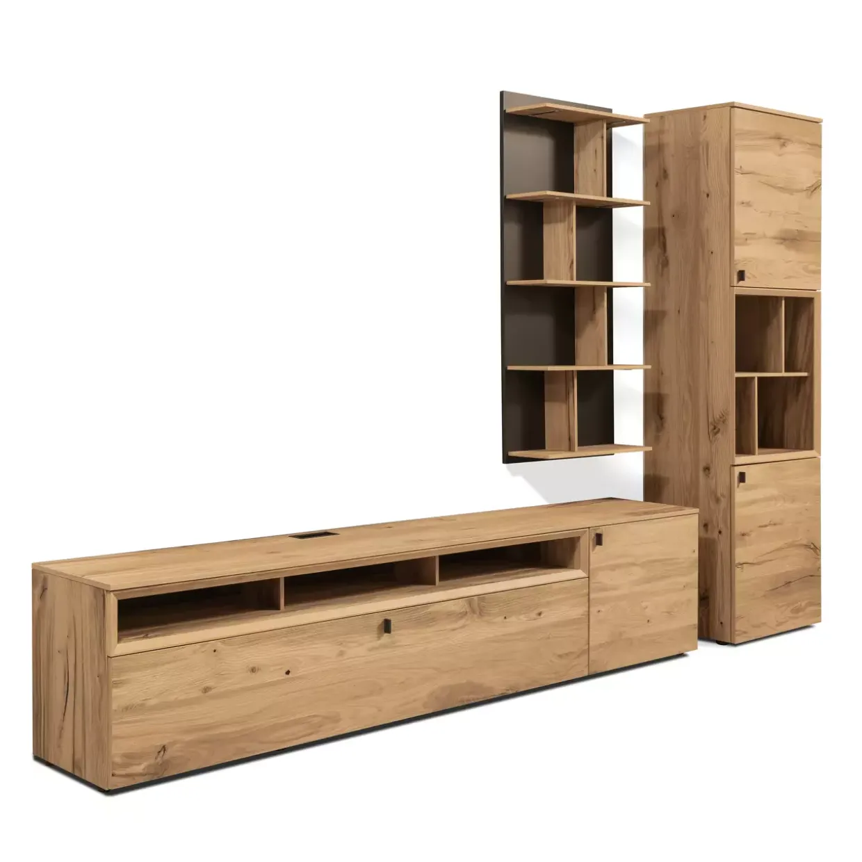 Die natürliche Maserung des Holzes, gepaart mit der matten Lackierung, strahlt Ruhe und Beständigkeit aus. Diese Wohnwand ist nicht nur ein Möbelstück, sondern ein Statement, das Ihre Wohnräume aufwertet und ein Gefühl von Harmonie und Komfort vermittelt.