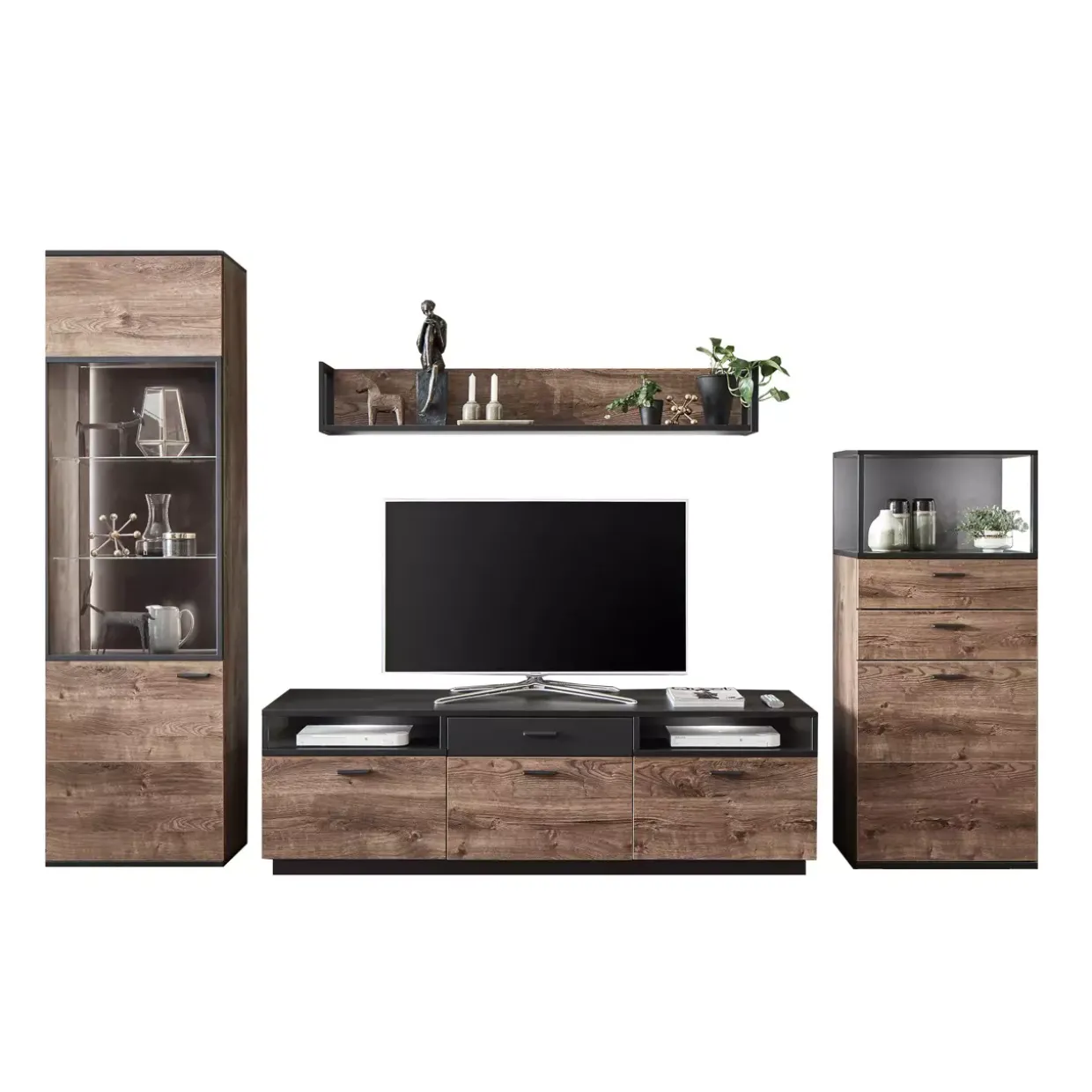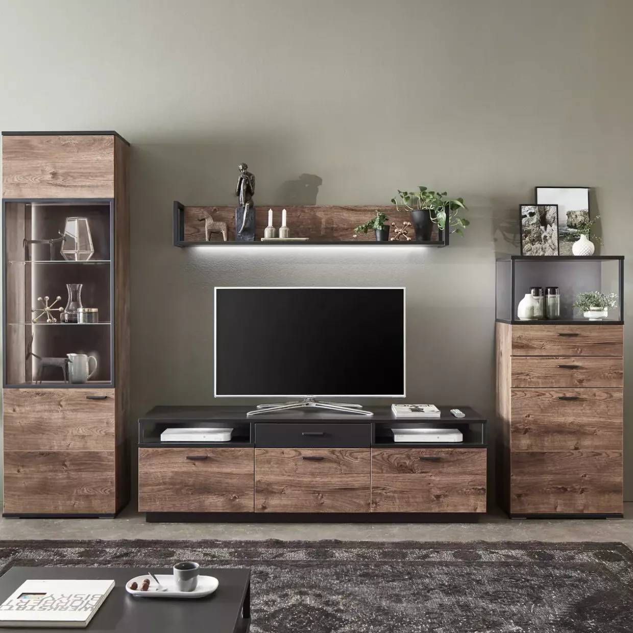 Farblich überzeugt die Wohnkombination mit der subtilen Eleganz von Eiche Ribbeck Cognac und der modernen Ausstrahlung von Cosmos grey Melamin. Diese Farbpalette harmoniert perfekt mit verschiedenen Inneneinrichtungsstilen und setzt gleichzeitig markante Akzente. Besonders in großen Räumen entfaltet das Möbelstück seine volle Wirkung und schafft ein einladendes Ambiente.