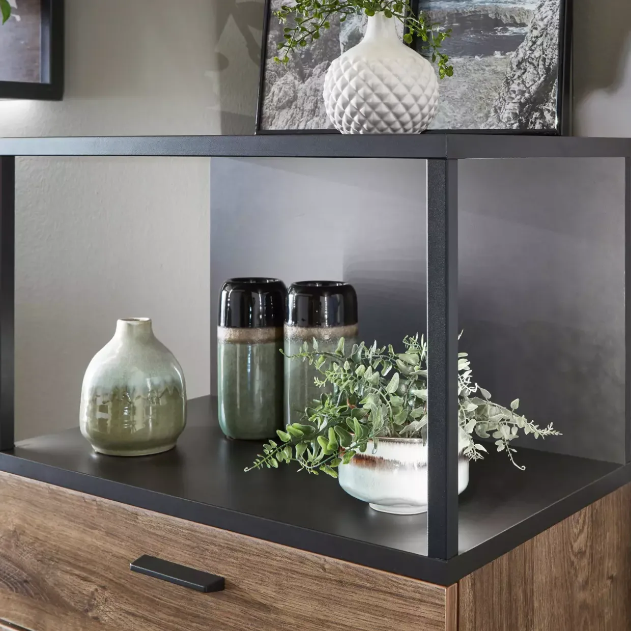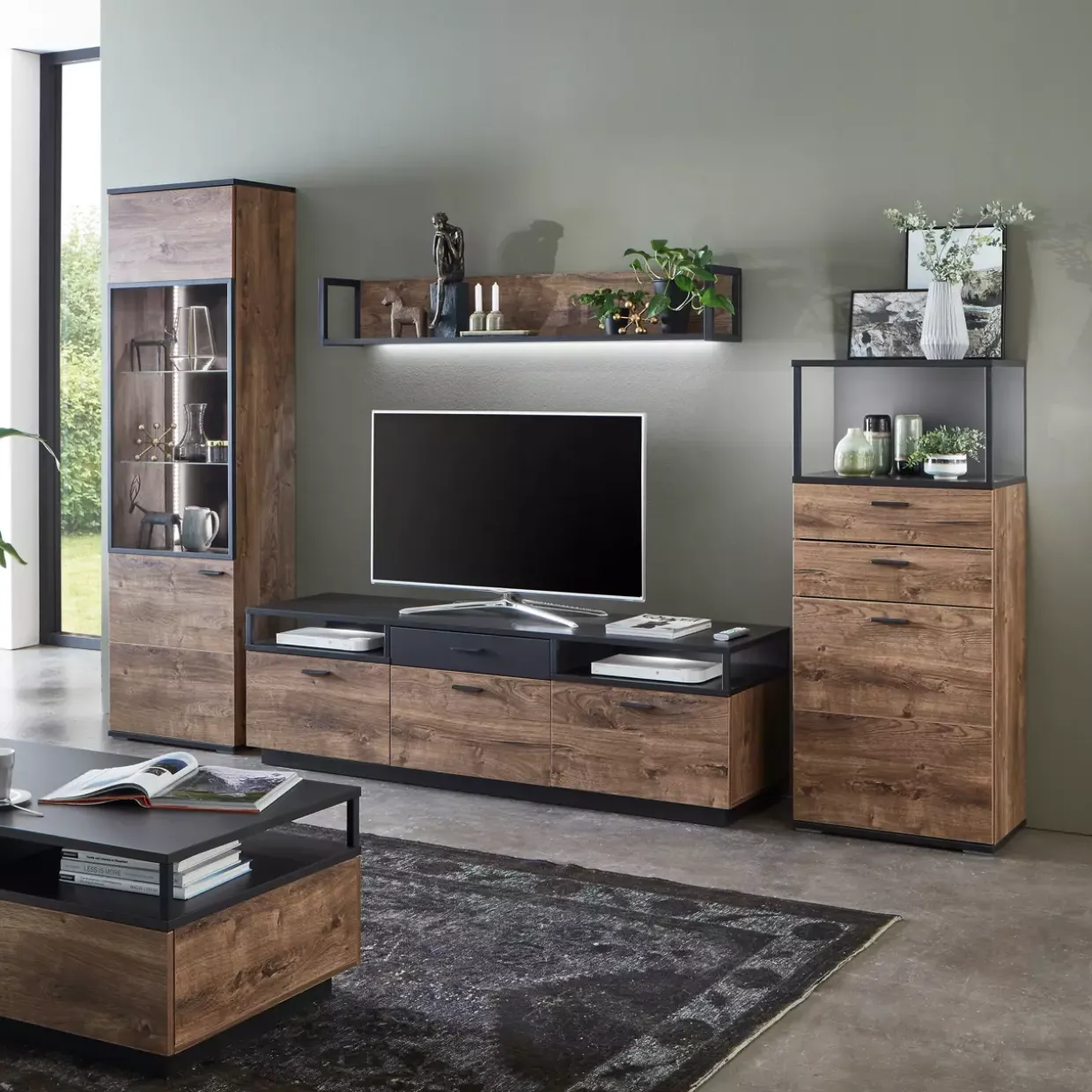Die elegante Türdämpfung der Bacoor Wohnkombination macht das Öffnen und Schließen der Türen zu einem leisen Vergnügen. Stilvoll in Loft-Design gehalten, verbindet dieses Möbelstück moderne Ästhetik mit funktionaler Raffinesse. Ideal für jene, die eine harmonische Integration von Form und Funktion suchen, besticht die Kombination durch ihre Materialwahl. Der Holzwerkstoff sorgt nicht nur für Stabilität, sondern verleiht dem Raum auch eine natürliche Wärme.
