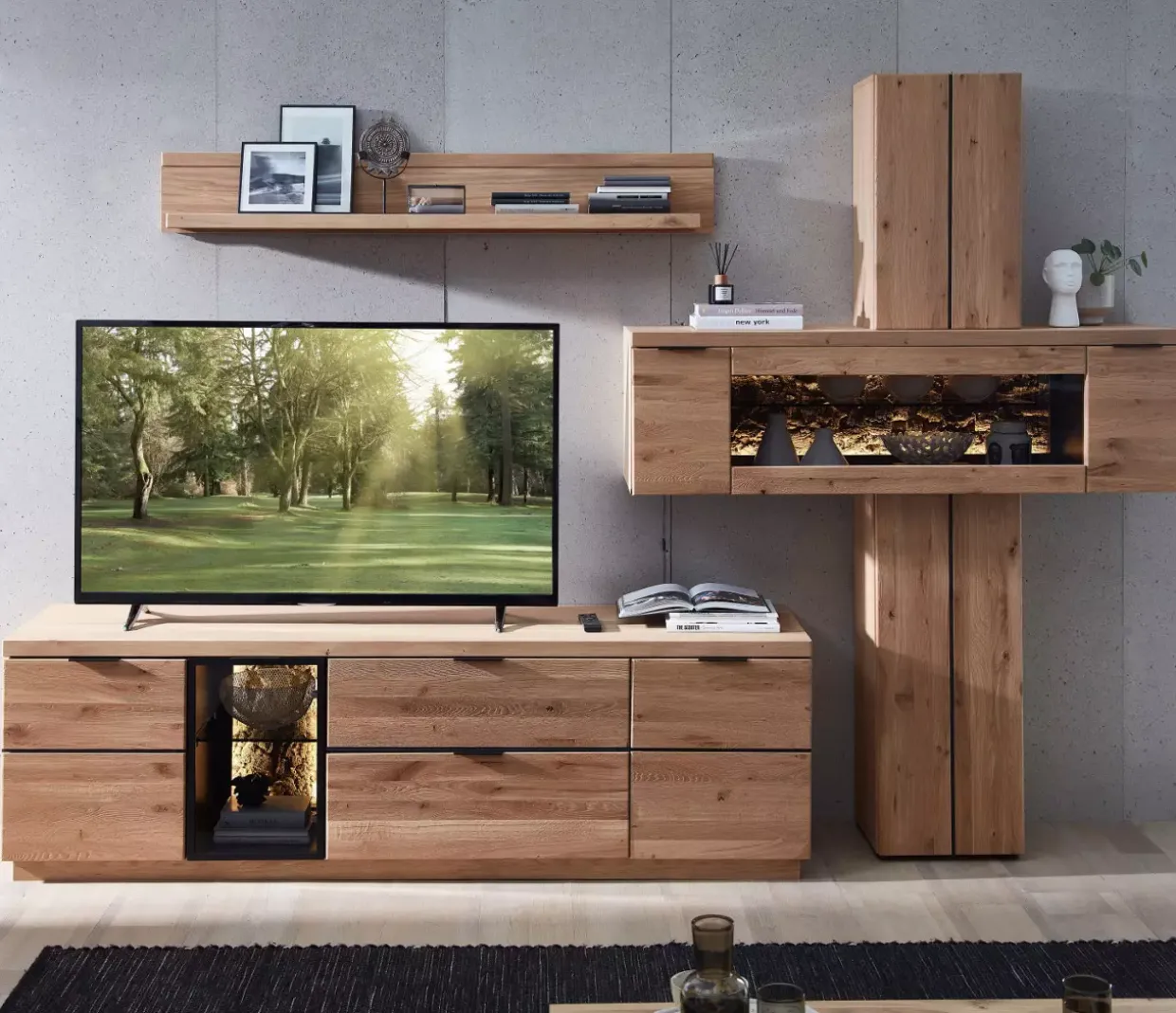 Zusatzmaße: Wandbord: 150x22x24cm / Stauraum-Säule: 140x203x42cm / Lowboard: 200x60x50cm