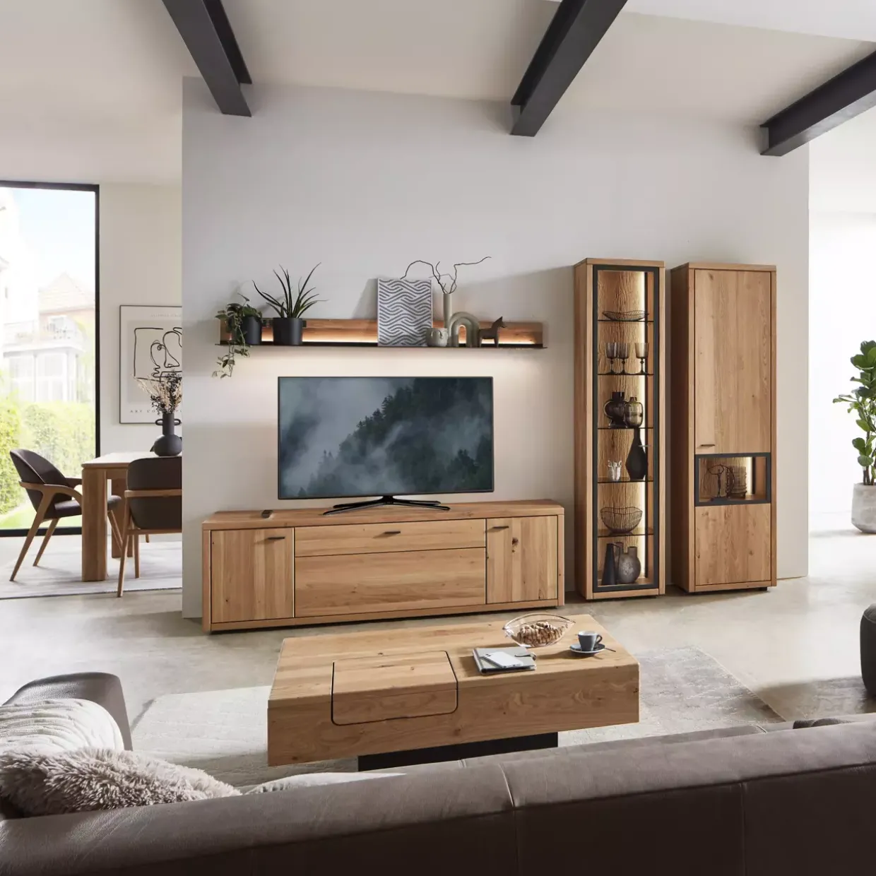 In der modernen Wohnwand Olbia vereinen sich Ästhetik und Funktionalität. Der Stil dieser Wohnwand besticht durch das Zusammenspiel von massivem, soft gebürstetem Wildeichenholz und pulverbeschichtetem Cubanit. Diese Mischung bringt einen zeitgemäßen Look in Ihr Wohnzimmer.