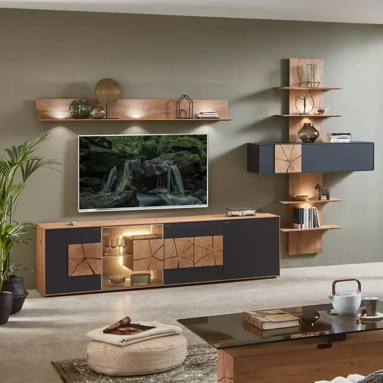 Das Zusammenspiel von hochwertigen Materialien und durchdachter Gestaltung macht diese Wohnwand zu einem besonderen Element Ihrer Einrichtung.