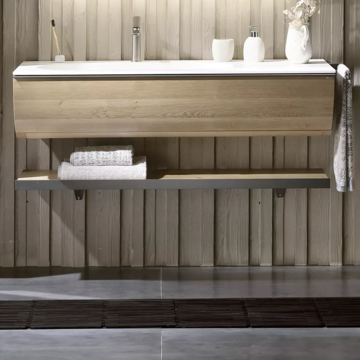 Klares Design und Funktionalität stehen im Vordergrund, was das Vquell Modell zu einem unverzichtbaren Begleiter im Alltag macht. Lassen Sie sich von der Harmonie aus natürlichen und industriellen Elementen inspirieren und schaffen Sie einen Ort der Ordnung und Ruhe in Ihrem Badezimmer.