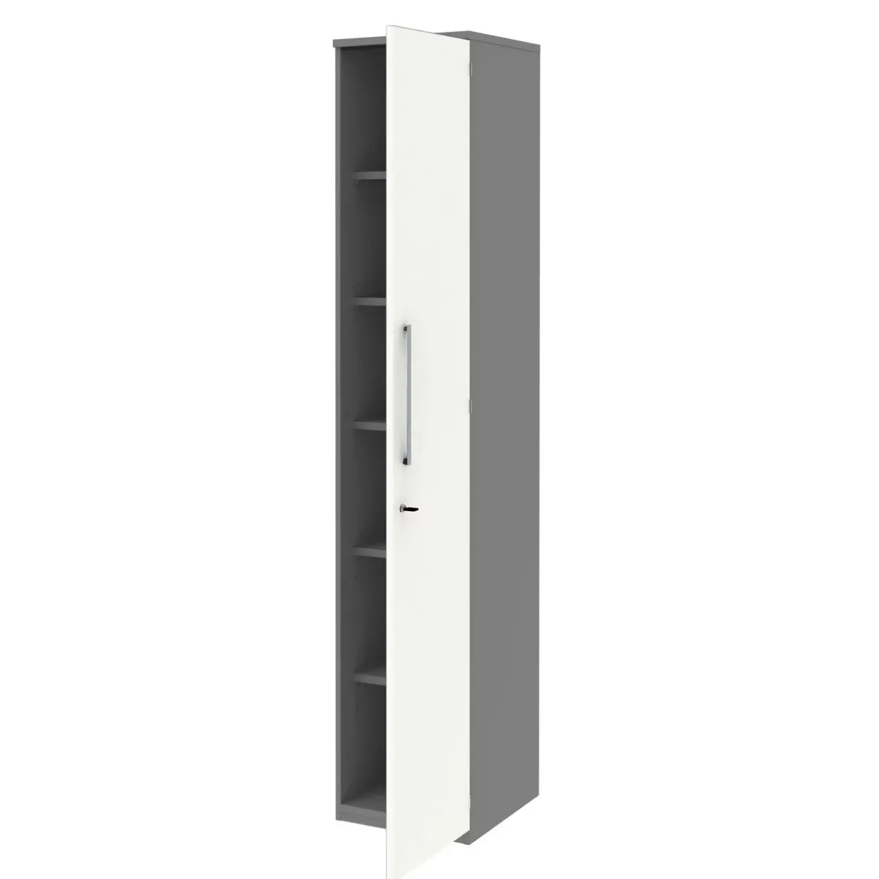 Eine melaminharzbeschichtete Oberfläche verleiht diesem Aktenelement eine robuste und gleichzeitig elegante Erscheinung. Das moderne Design kombiniert mittelgraue, weiße und alufarbige Akzente, die jedem Büro eine stilvolle Note verleihen. Funktionalität trifft auf Sicherheit: Mit einer Tür, vier Einlegeböden und einem festen Boden bietet es ausreichend Platz, um Dokumente und Büromaterialien übersichtlich unterzubringen.