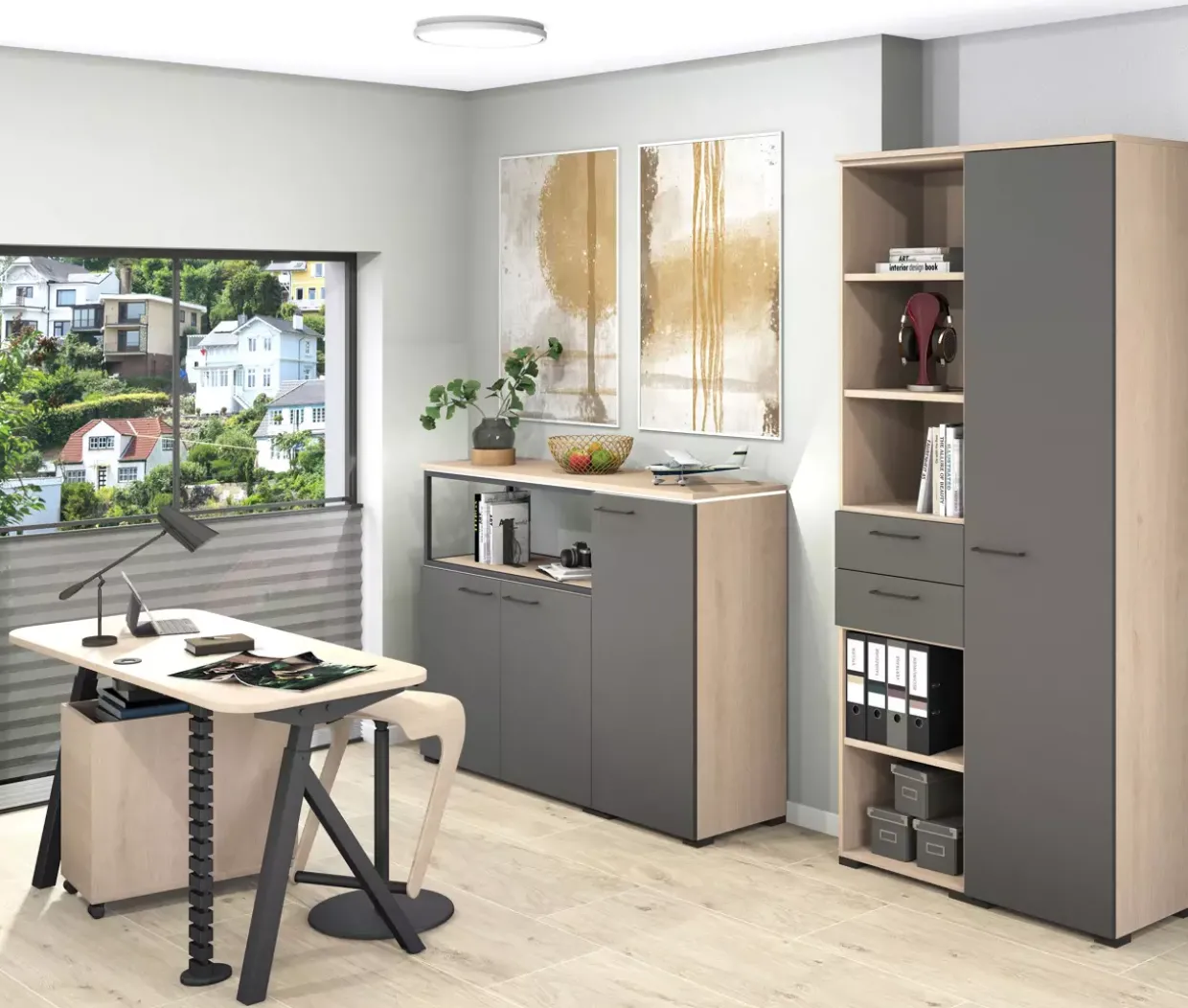 Die klare Linienführung und das durchdachte Design machen dieses Möbelstück zu einem funktionalen Begleiter im Arbeitsalltag. Die Farbpalette aus Anthrazit und Graphit matt fügt sich nahtlos in moderne Bürokonzepte ein und bietet zudem eine pflegeleichte Oberfläche. So bleibt das Möbelstück trotz intensiver Nutzung stets in einem ansprechenden Zustand.
