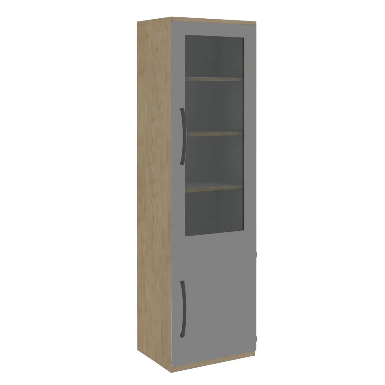 Die faszinierende Kombination aus Glas, Holzwerkstoff und Metall verleiht diesem Aktenelement eine moderne Anmutung, die in jedem Büro beeindruckt. Mit einer melaminharzbeschichteten Oberfläche bietet es nicht nur eine stilvolle Optik, sondern auch praktische Vorteile: kratzfest, stoßfest, feuchtigkeitsabweisend und lichtbeständig. Die Farbgebung in Hickory Nachbildung, Mittelgrau und Anthrazit schafft eine harmonische und zugleich trendige Atmosphäre.