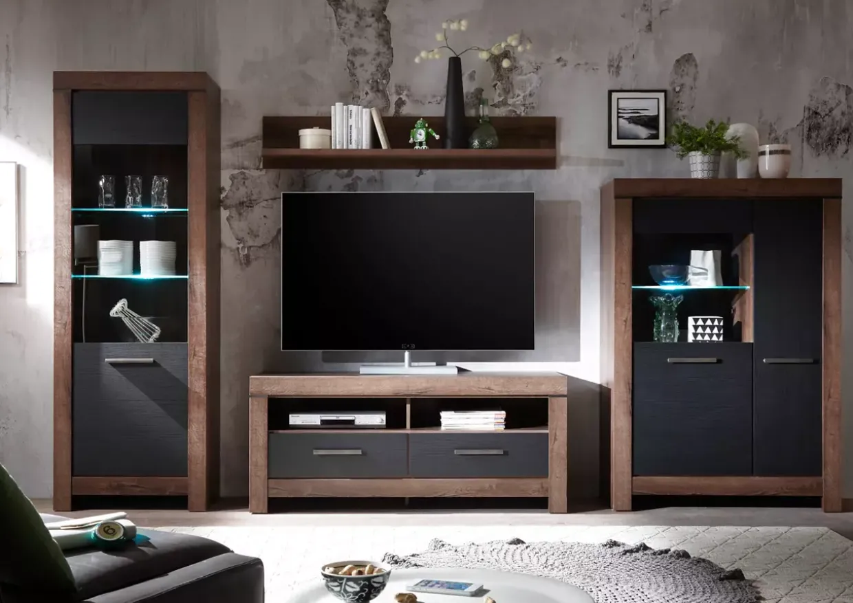 Eiche Canyon verleiht der Balin Anbauwand eine warme und einladende Ausstrahlung, während Schwarze Eiche einen Hauch von Eleganz und Modernität hinzufügt. Beide Farbvarianten bieten eine besondere Möglichkeit, Ihre Wohnräume stilvoll und zeitgemäß zu gestalten. Holz als Material bringt eine natürliche Robustheit und Beständigkeit mit sich und sorgt so für Langlebigkeit und eine angenehme Haptik.Die Anbauwand fügt sich harmonisch in unterschiedliche Einrichtungsstile ein und bietet dabei nicht nur ästhetische, sondern auch funktionale Vorteile. Durch die durchdachte Gestaltung können Sie Ihre Wohnräume optimal nutzen und gleichzeitig einen ordentlichen und aufgeräumten Eindruck hinterlassen. Die Kombination aus Design und Funktionalität macht diese Anbauwand zu einem idealen Element für anspruchsvolle Wohnkonzepte.Holz, das in seiner natürlichen Schönheit erstrahlt, vermittelt ein Gefühl von Geborgenheit und Wärme. Die sorgfältige Verarbeitung der Materialien unterstreicht die hohe Qualität des Produkts. Wenn Sie also auf der Suche nach einem Möbelstück sind, das sowohl optisch als auch praktisch überzeugt, könnte diese Anbauwand die richtige Wahl sein. Lassen Sie sich von der zeitlosen Schönheit und Vielseitigkeit inspirieren und schaffen Sie einen Raum, der Ihre Persönlichkeit widerspiegelt.