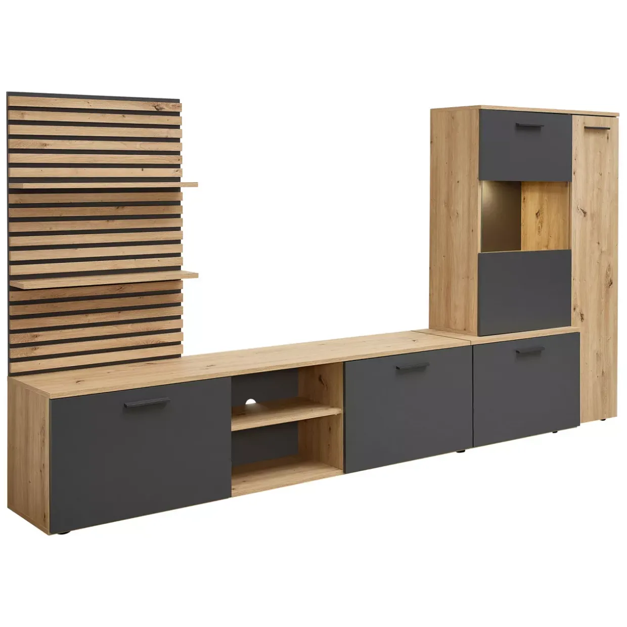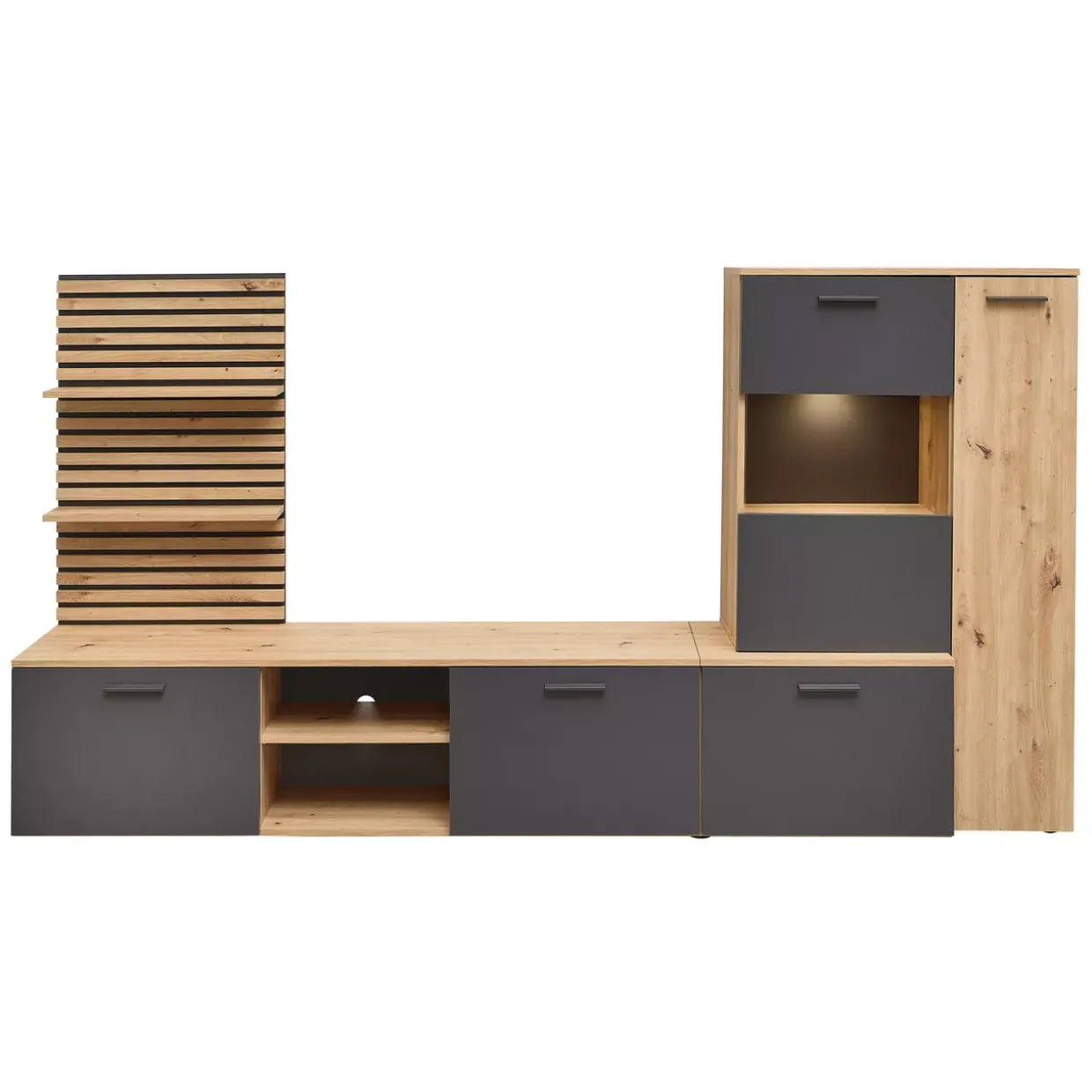 Modernes Design trifft auf Funktionalität: Die Heathrow Anbauwand vereint stilvolle Ästhetik mit praktischen Elementen. Eine der herausragenden Eigenschaften ist die Verwendung von Holz und Holzwerkstoffen, die dem Möbelstück eine natürliche Eleganz verleihen. Die Kombination aus dem warmen Ton von Artisan Eiche und dem kühlen Anthrazit schafft ein harmonisches Farbspiel, das sich nahtlos in zeitgemäße Wohnräume einfügt.Ein weiteres Highlight ist die integrierte LED-Beleuchtung, die nicht nur für stimmungsvolle Akzente sorgt, sondern auch die Möglichkeit bietet, Ihre Dekorationen ins rechte Licht zu rücken. Dies kann besonders abends für eine gemütliche Atmosphäre sorgen. Die Anbauwand bietet ausreichend Stauraum und ist damit eine ideale Lösung für Wohnzimmer, die sowohl Ordnung als auch Stil erfordern.Durch die klare Linienführung und das durchdachte Design wird diese Anbauwand zu einem echten Blickfang. Sie fügt sich mühelos in verschiedene Einrichtungsstile ein und bietet gleichzeitig die notwendige Funktionalität für den Alltag. Wenn Sie auf der Suche nach einer modernen und gleichzeitig praktischen Lösung für Ihr Wohnzimmer sind, könnte die Heathrow Anbauwand genau die richtige Wahl für Sie sein.