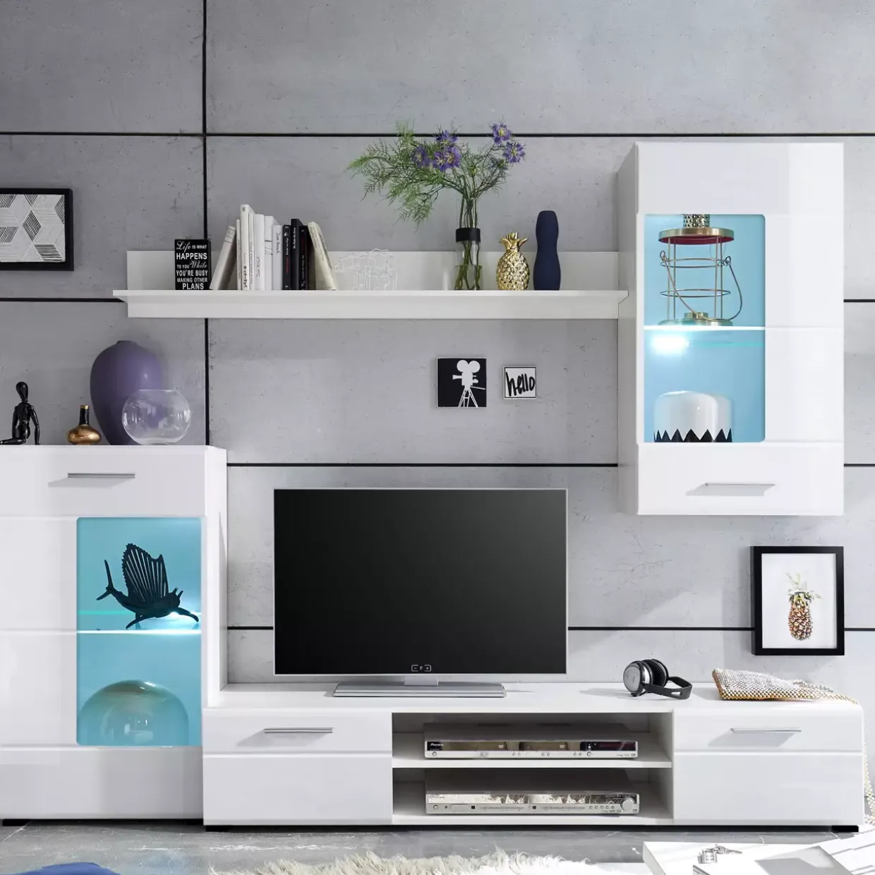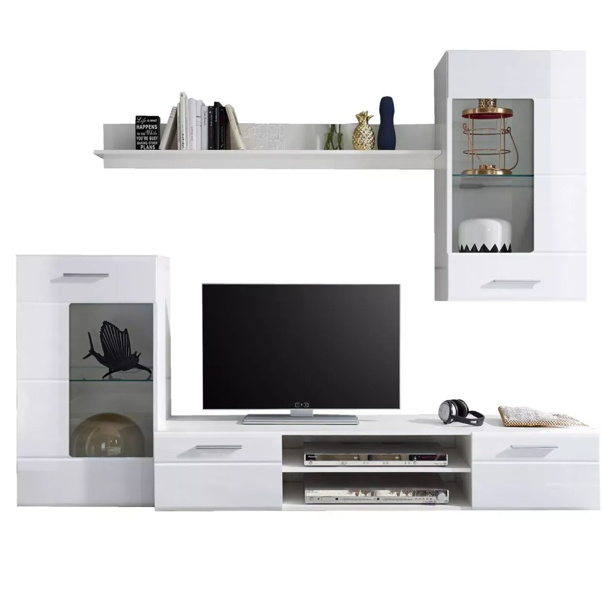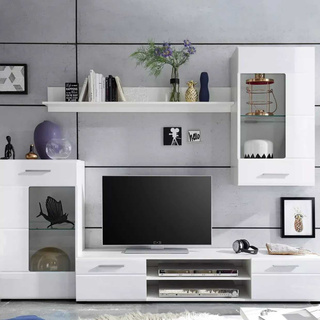 Ein Hauch von modernem Stil zieht in Ihr Zuhause ein mit der eleganten Anbauwand Shot. In einem harmonischen Zusammenspiel aus Weiß, Hochglanz weiß und silberfarbenen Akzenten fügt sich dieses Möbelstück perfekt in jedes zeitgenössische Wohnambiente ein. Die beiden Drehtüren bieten eine praktische und zugleich stilvolle Lösung, um Ihre Habseligkeiten diskret zu verstauen.