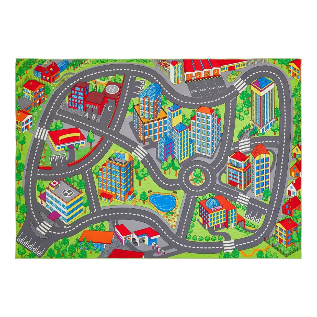 Ein kindgerechtes Design in Form einer detailreichen Spielstraße lädt kleine Entdecker ein, ihrer Fantasie freien Lauf zu lassen. Der moderne Stil des rechteckigen Kinder- und Spielteppichs bringt Leben in jedes Kinderzimmer und bietet eine bunte Kulisse für kreative Abenteuer.